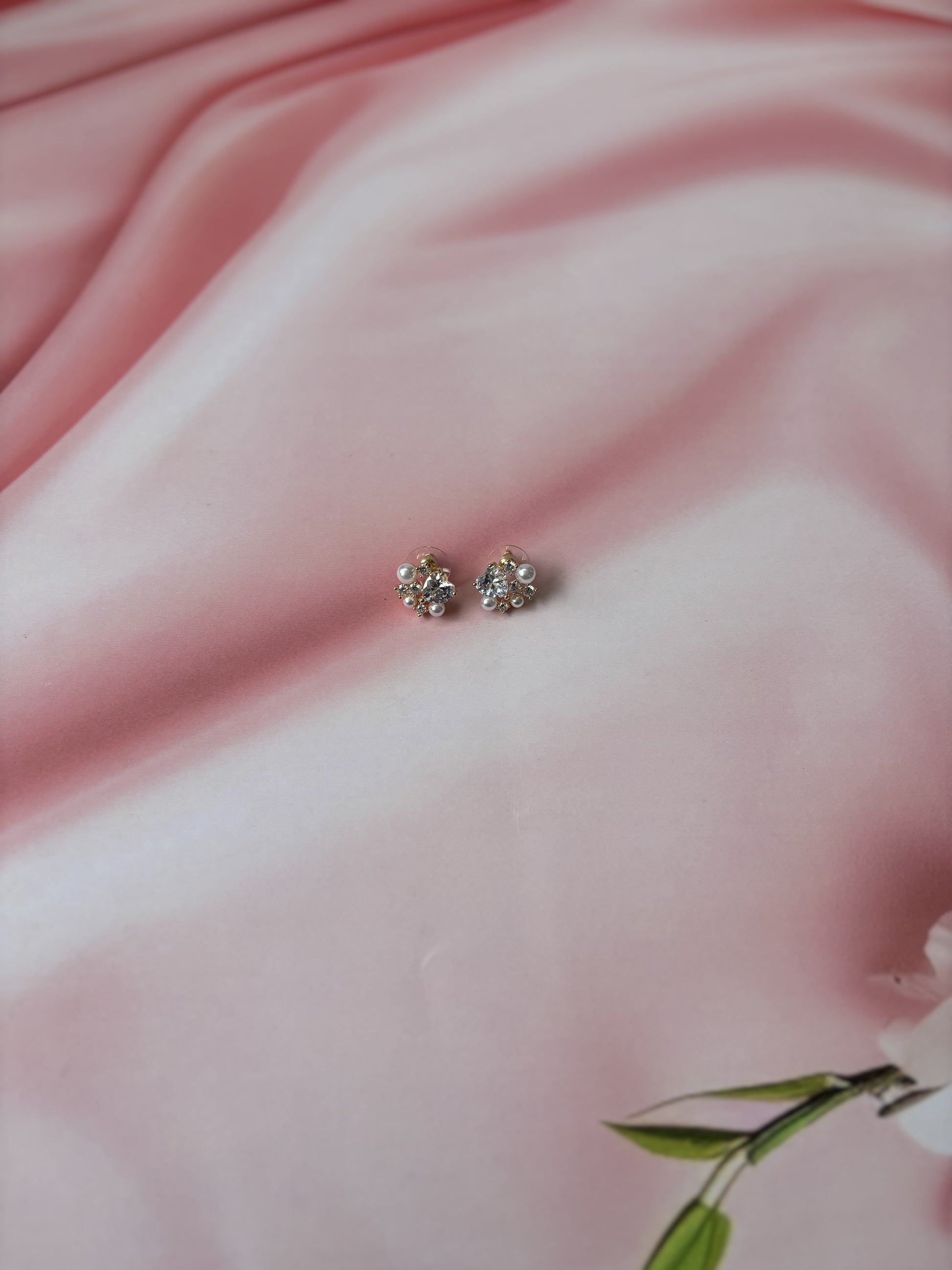 These delicate studs feature a heart-shaped design adorned with ad stones and pearls. Ideal for everyday and casual wear, they offer a stylish look while being anti-tarnish and hypoallergenic for lasting comfort.