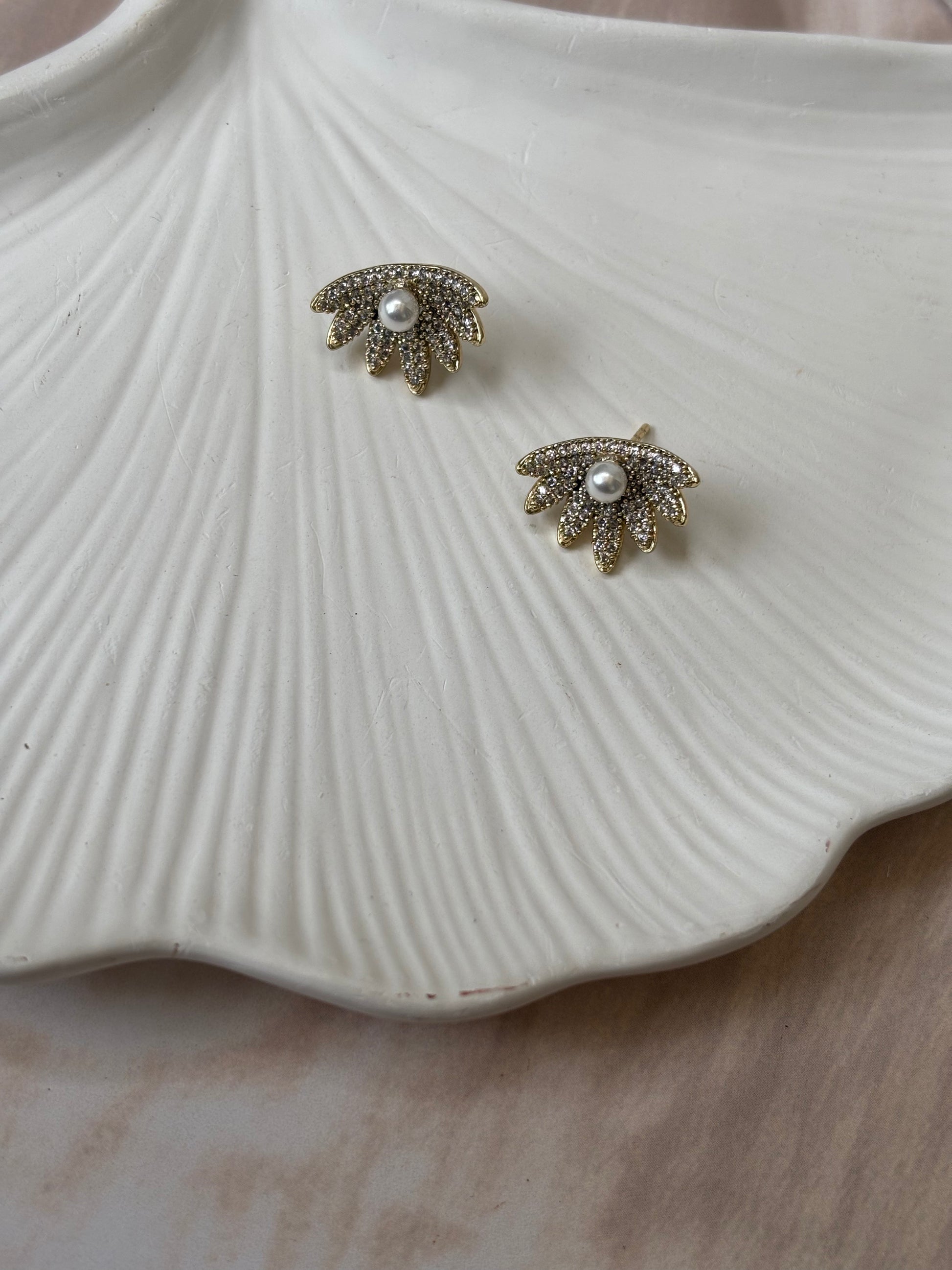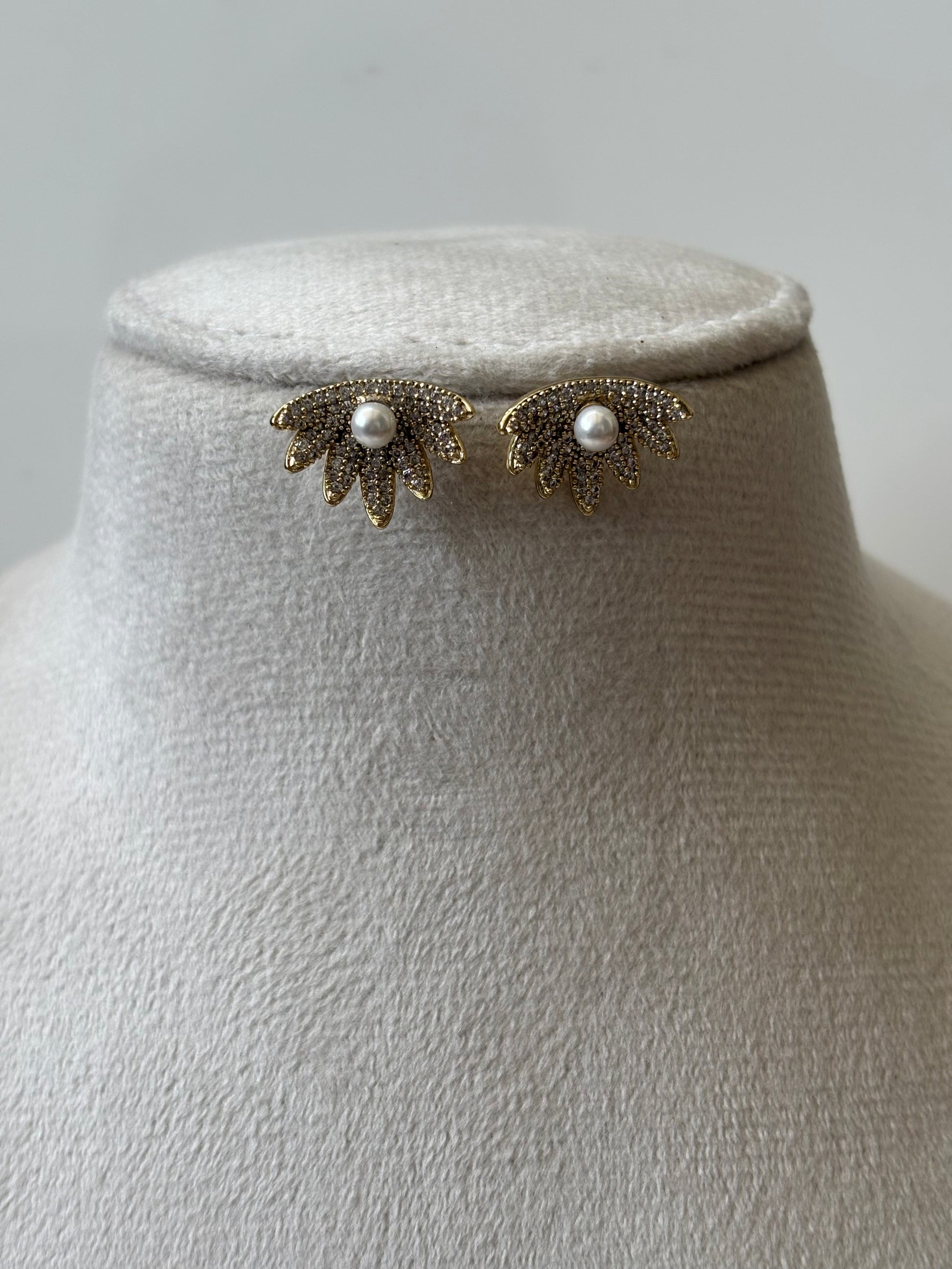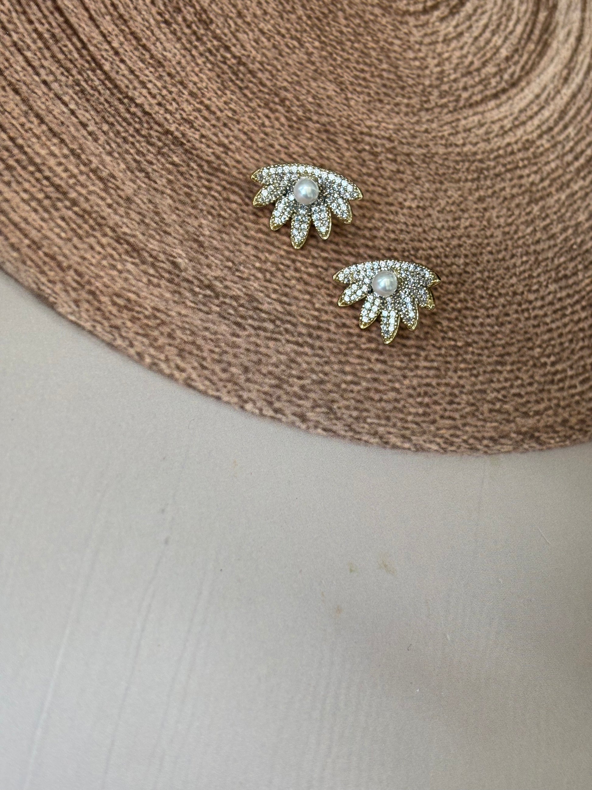 These pearl studs feature a feather design embedded with AD stones and are treated to resist tarnishing. Ideal for everyday wear and casual occasions.