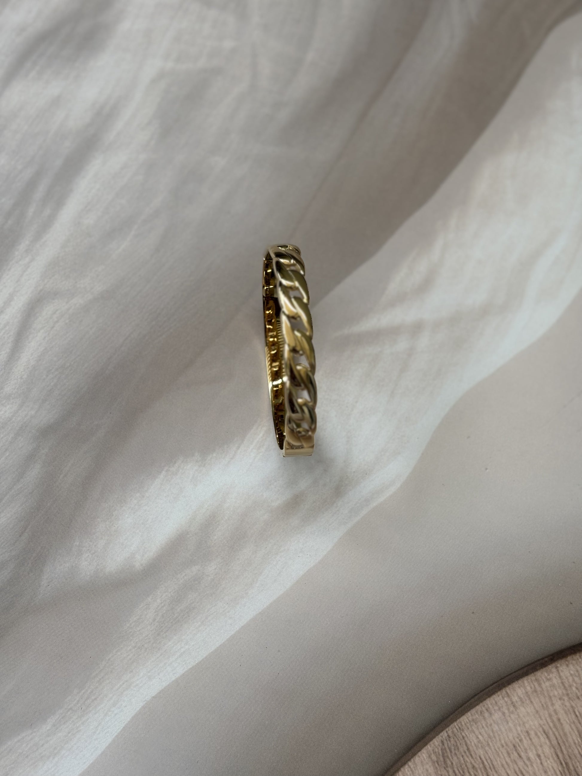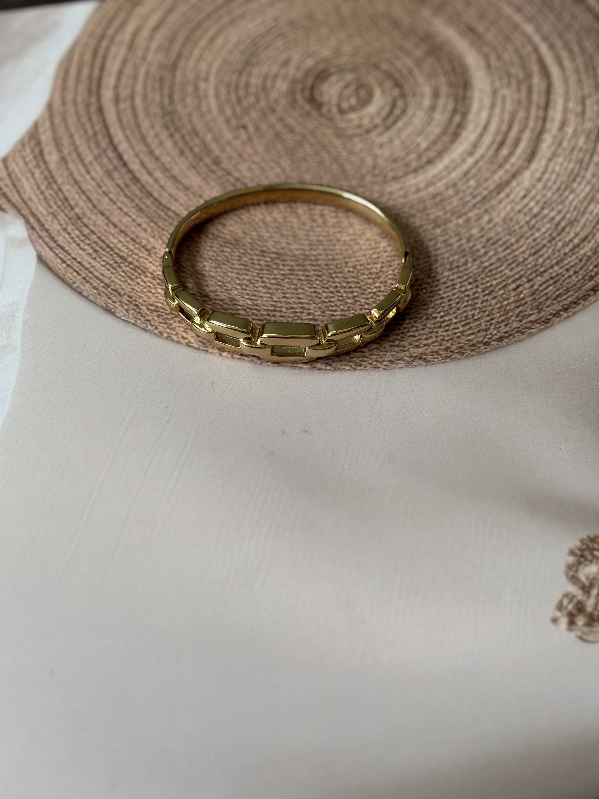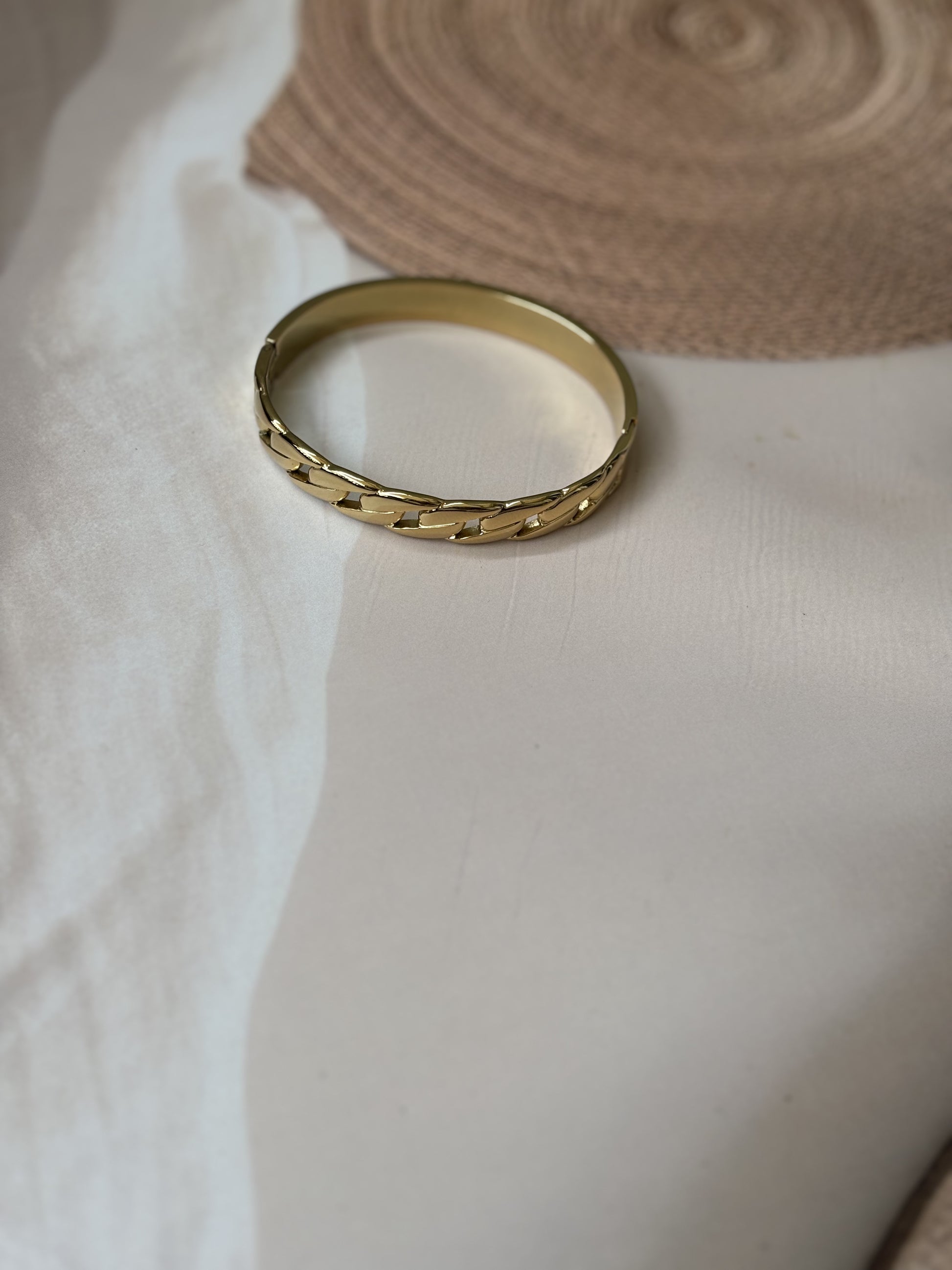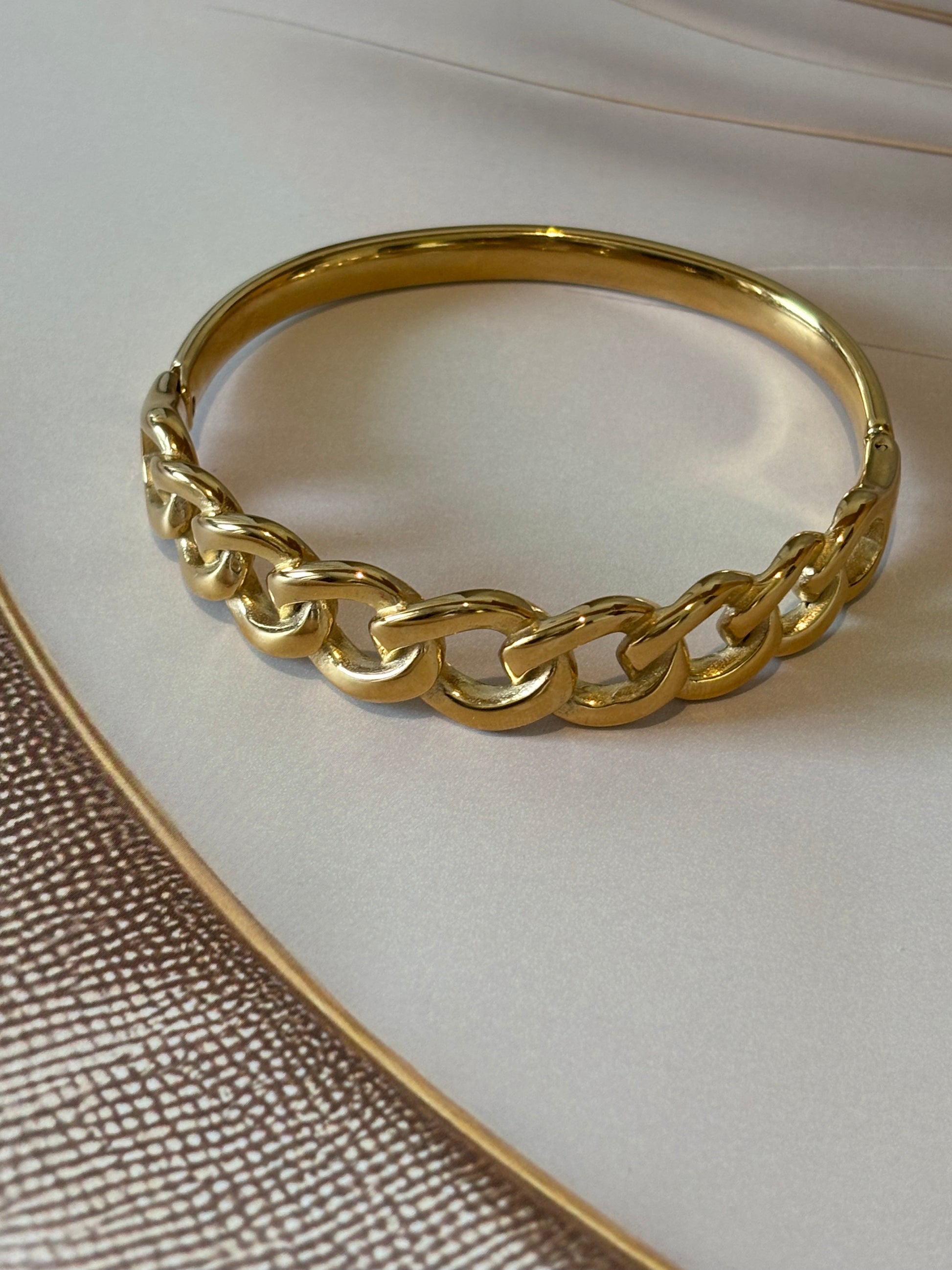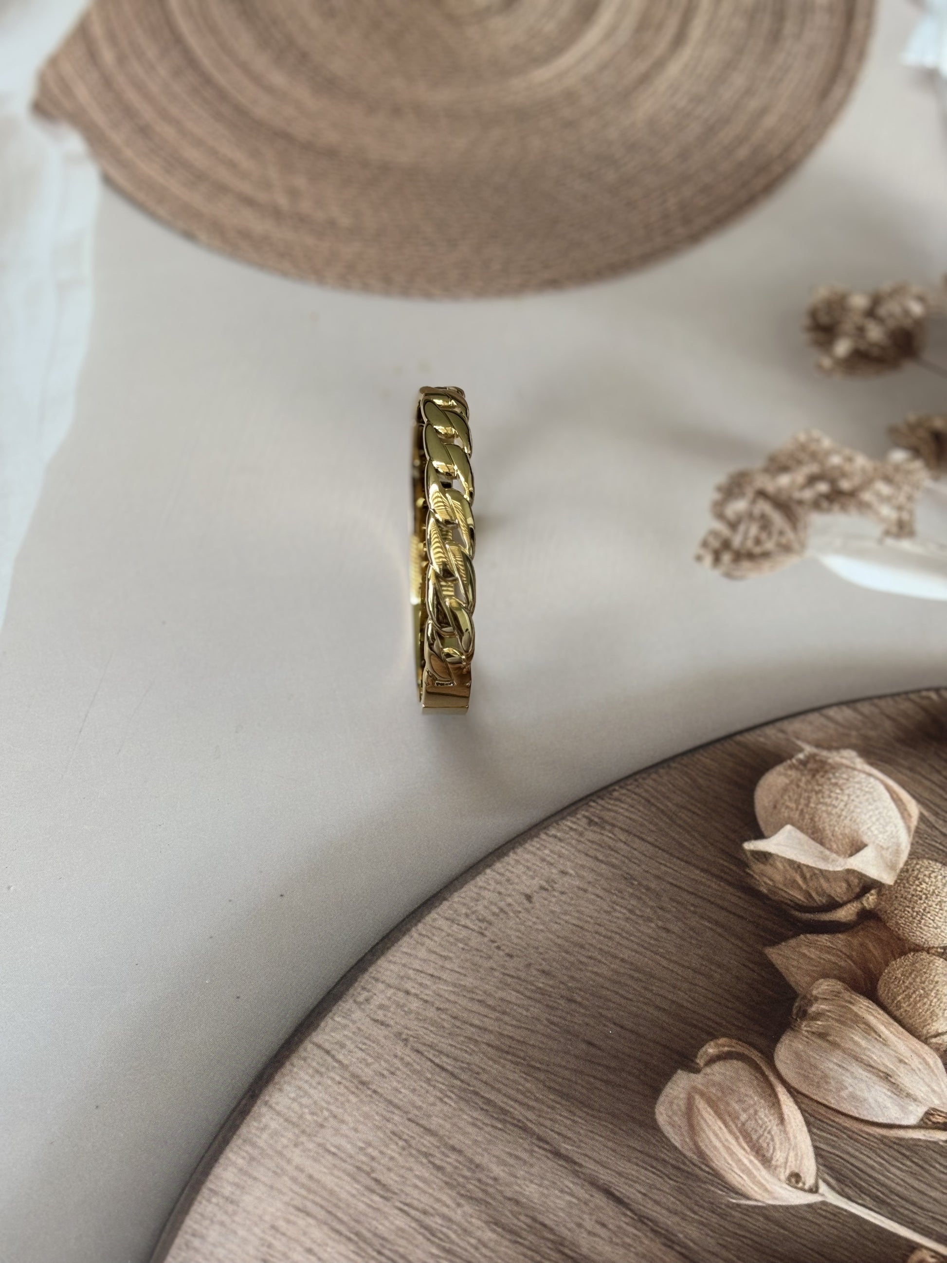 This broad golden bracelet features an antitarnish chain design, ensuring lasting shine and durability. Expertly crafted to complement casual and solid-color outfits, it adds a refined touch to everyday wear. Designed to fit wrist sizes 2.4" to 2.6", it offers a comfortable and secure fit for a variety of wearers.