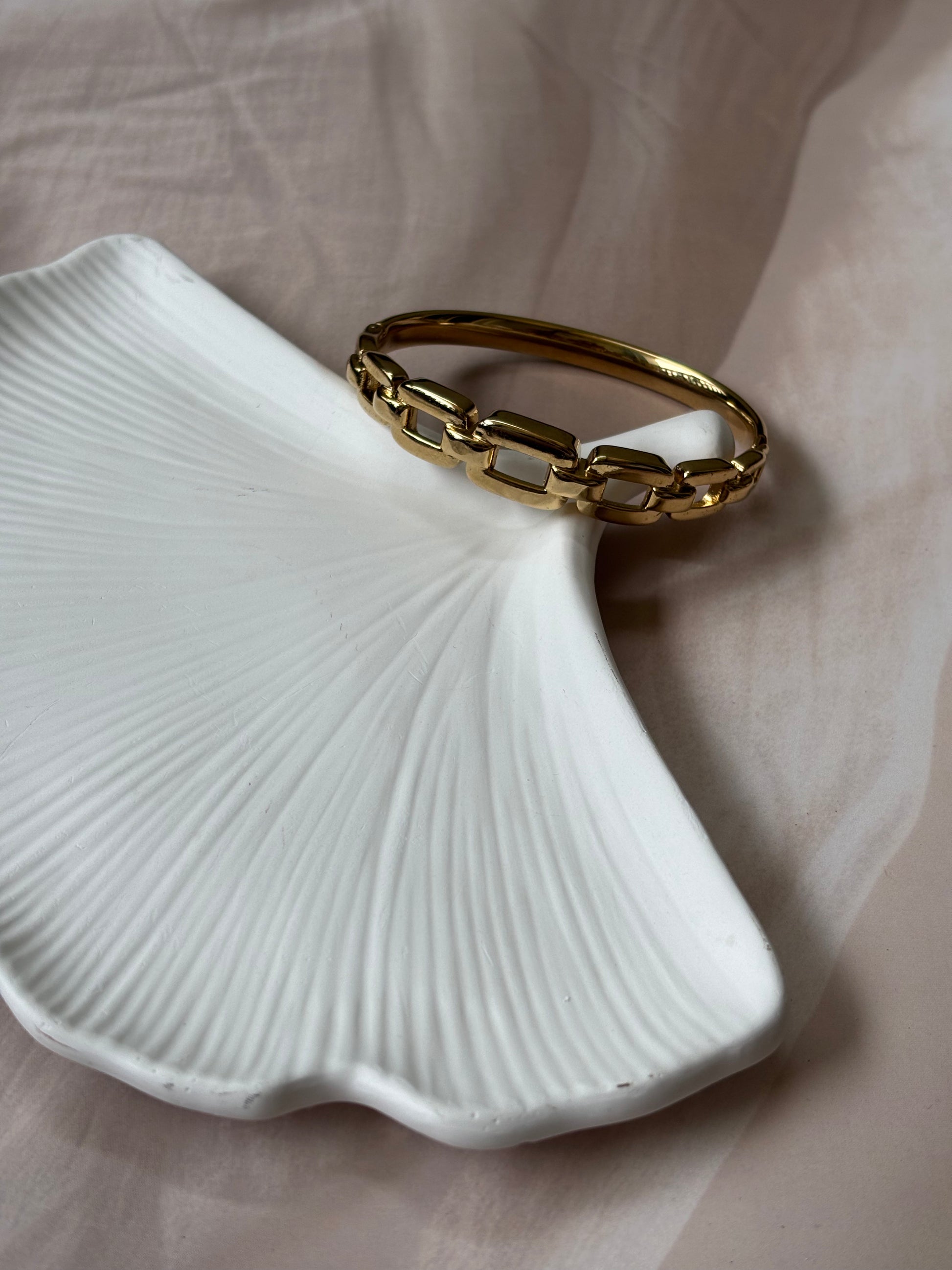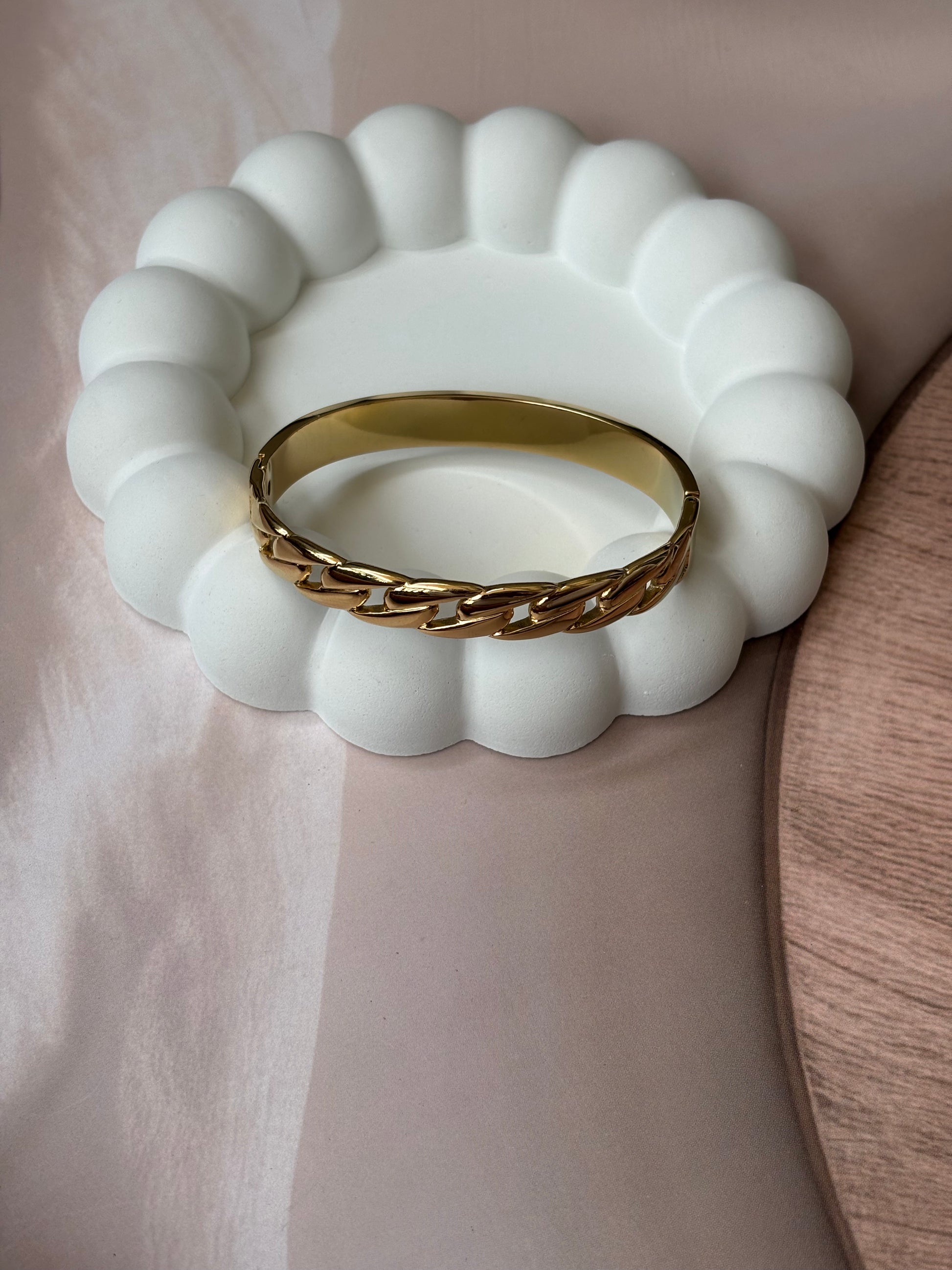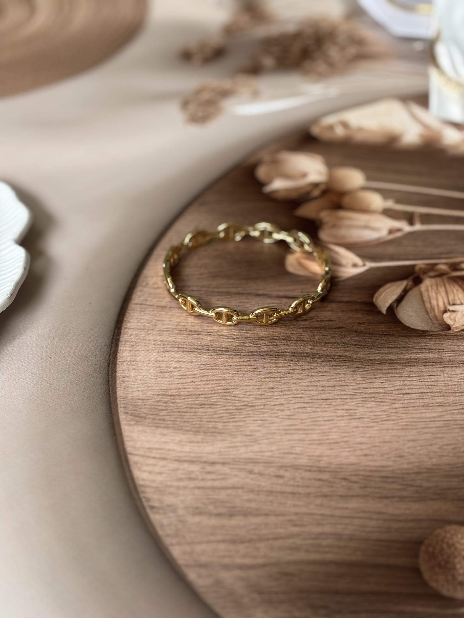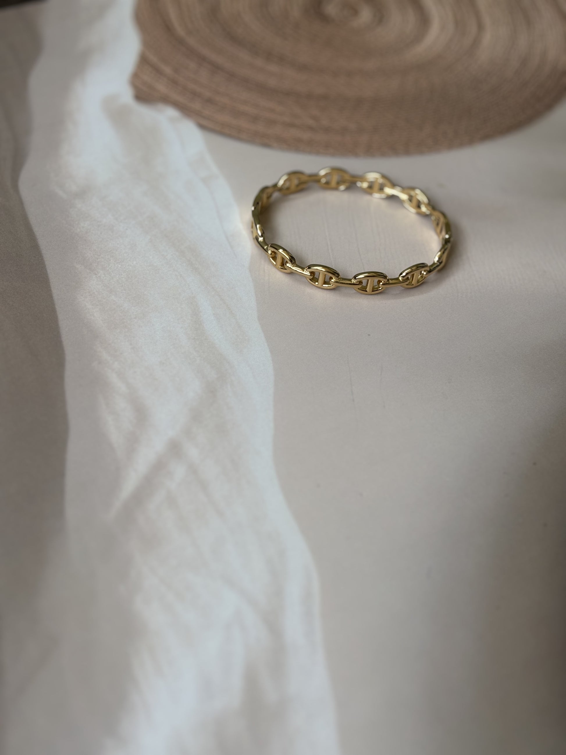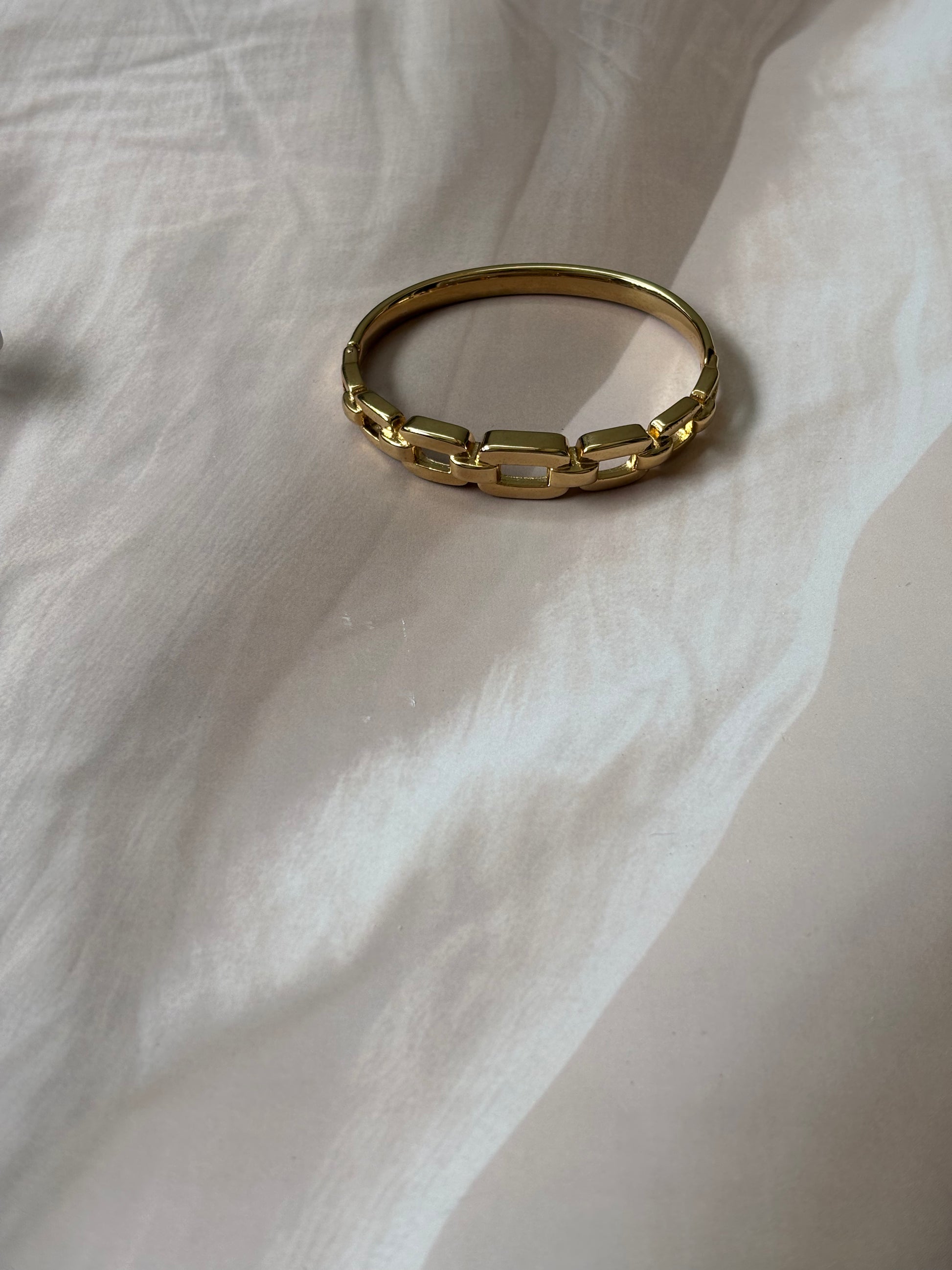 This broad golden bracelet features an antitarnish chain design, ensuring lasting shine and durability. Expertly crafted to complement casual and solid-color outfits, it adds a refined touch to everyday wear. Designed to fit wrist sizes 2.4" to 2.6", it offers a comfortable and secure fit for a variety of wearers.
