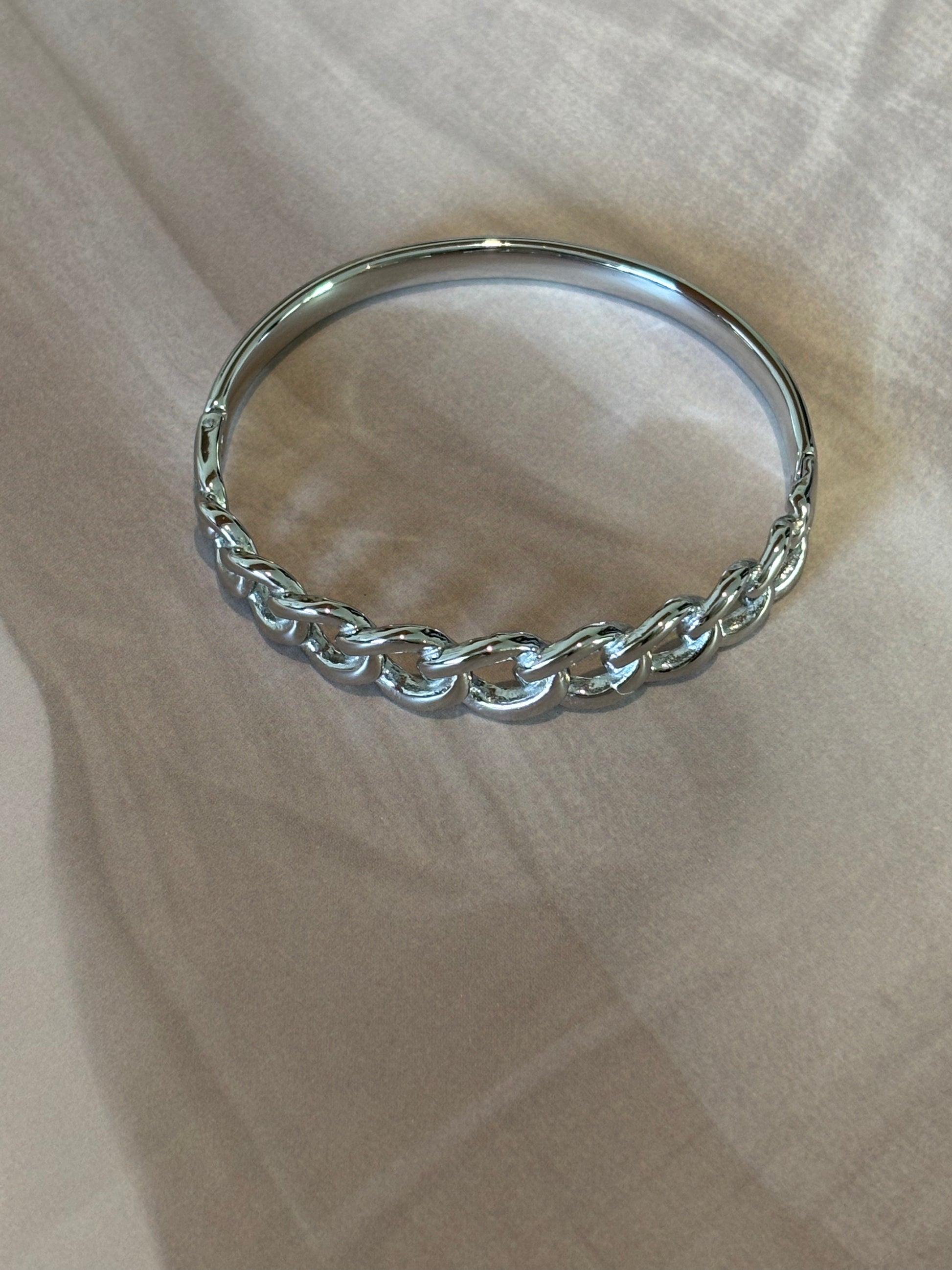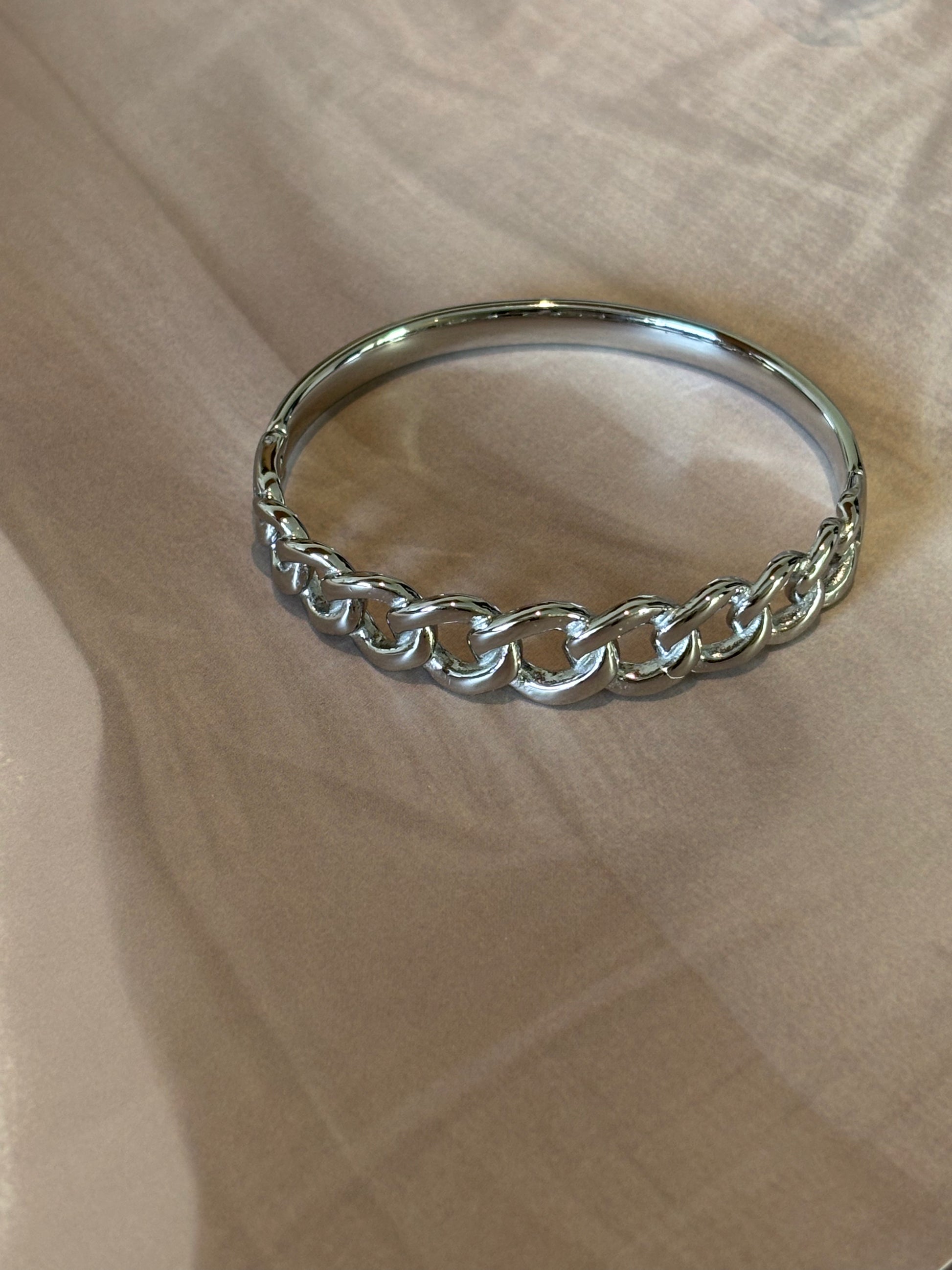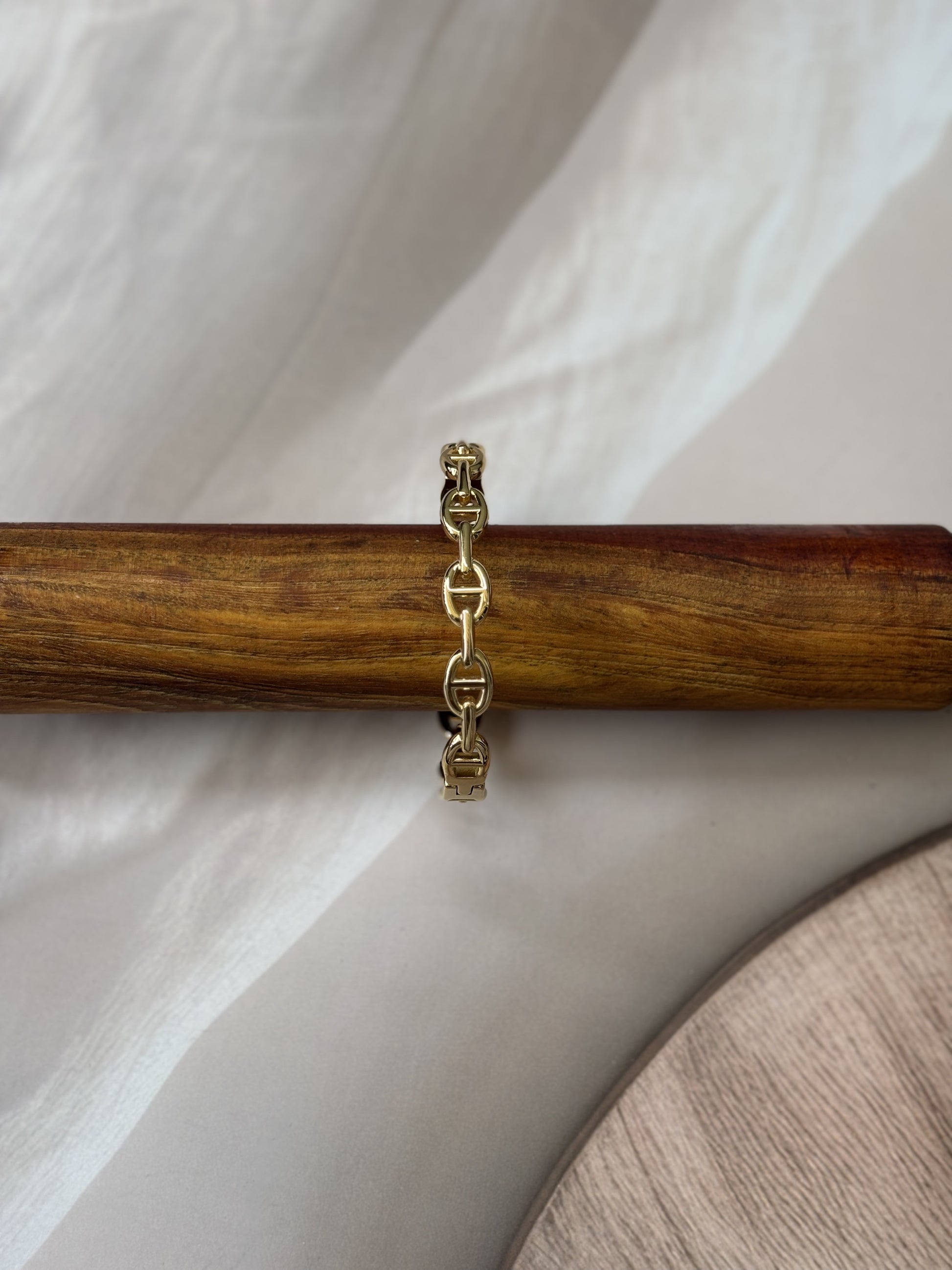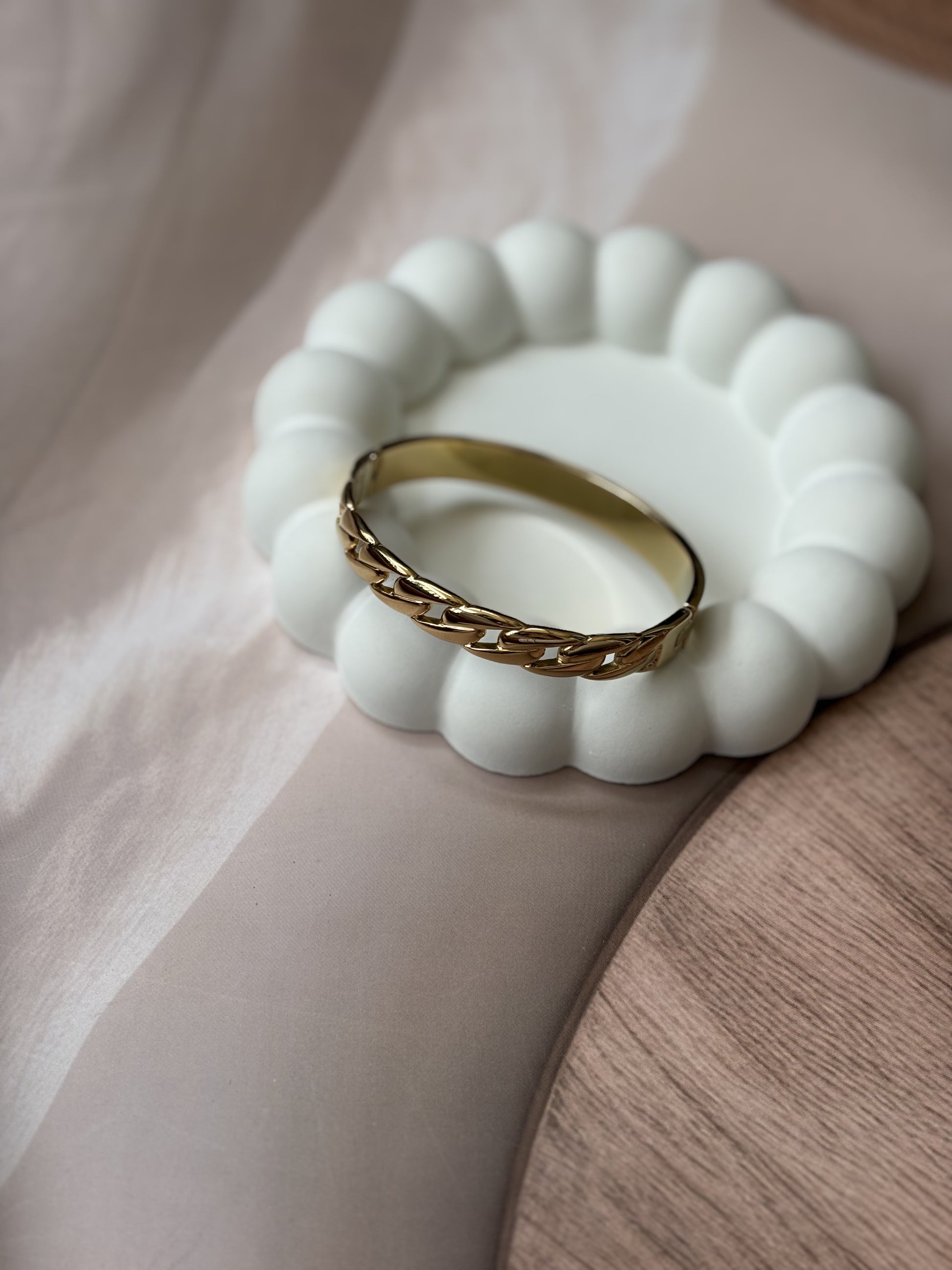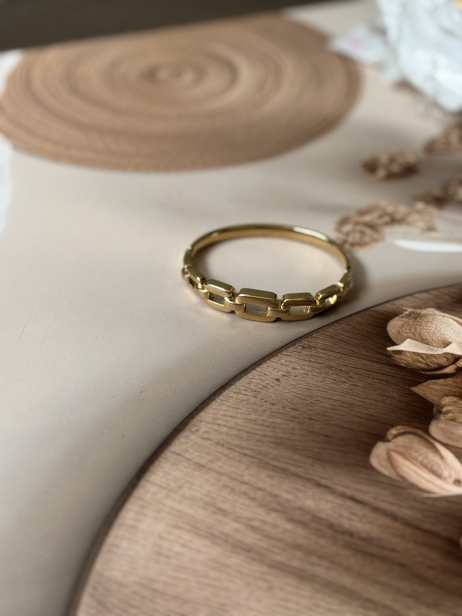 This broad golden bracelet features an antitarnish chain design, ensuring lasting shine and durability. Expertly crafted to complement casual and solid-color outfits, it adds a refined touch to everyday wear. Designed to fit wrist sizes 2.4" to 2.6", it offers a comfortable and secure fit for a variety of wearers.