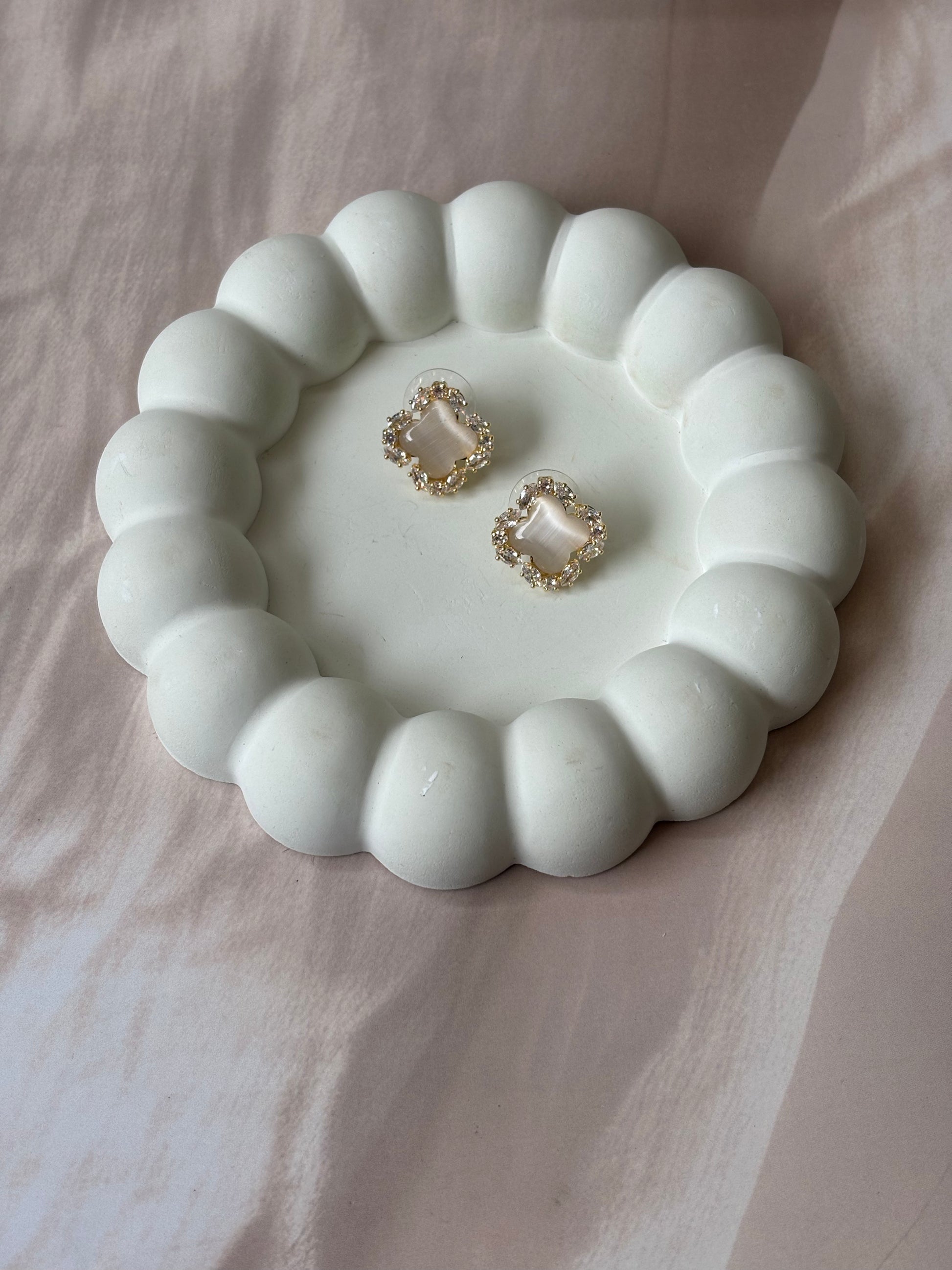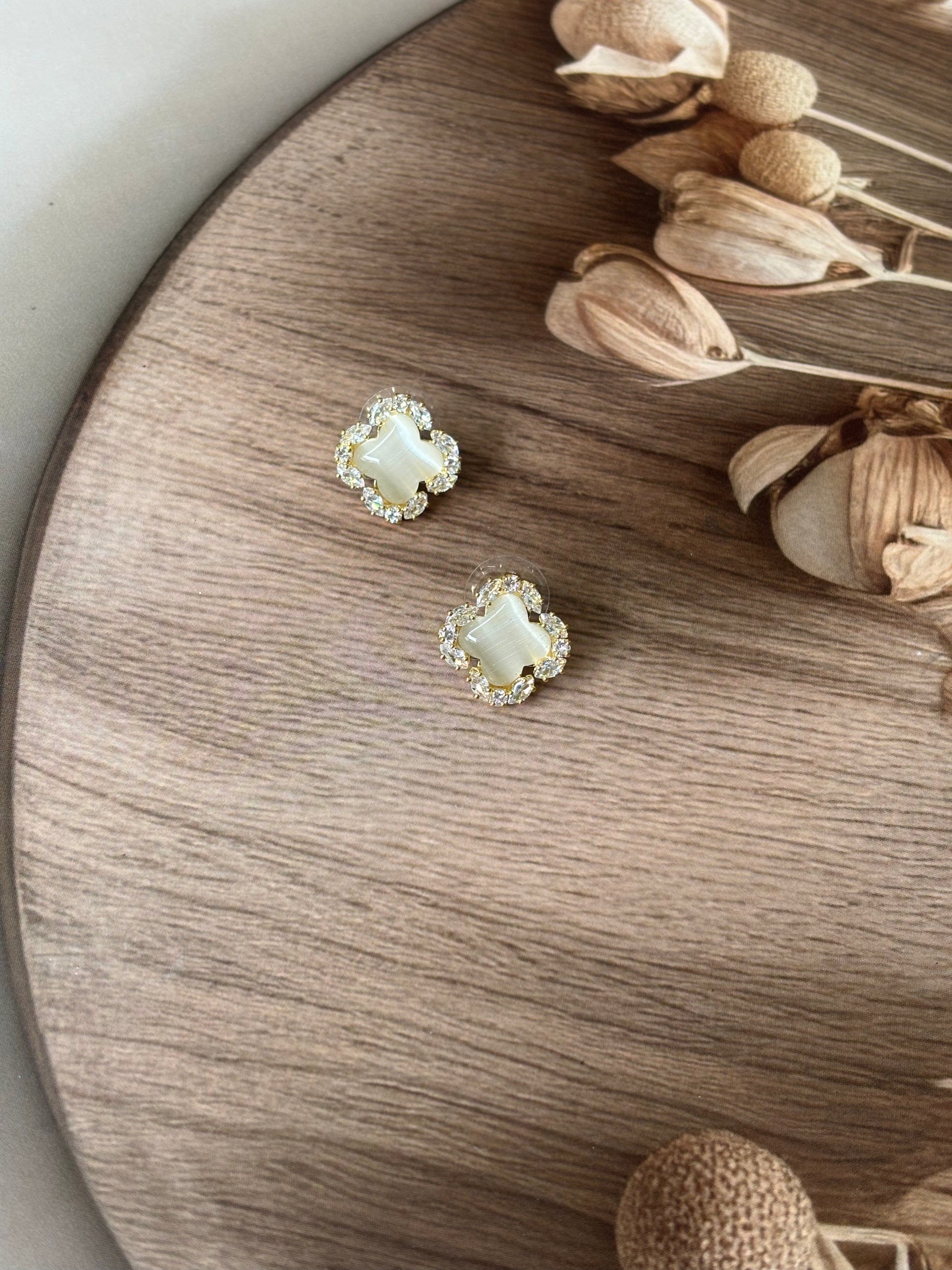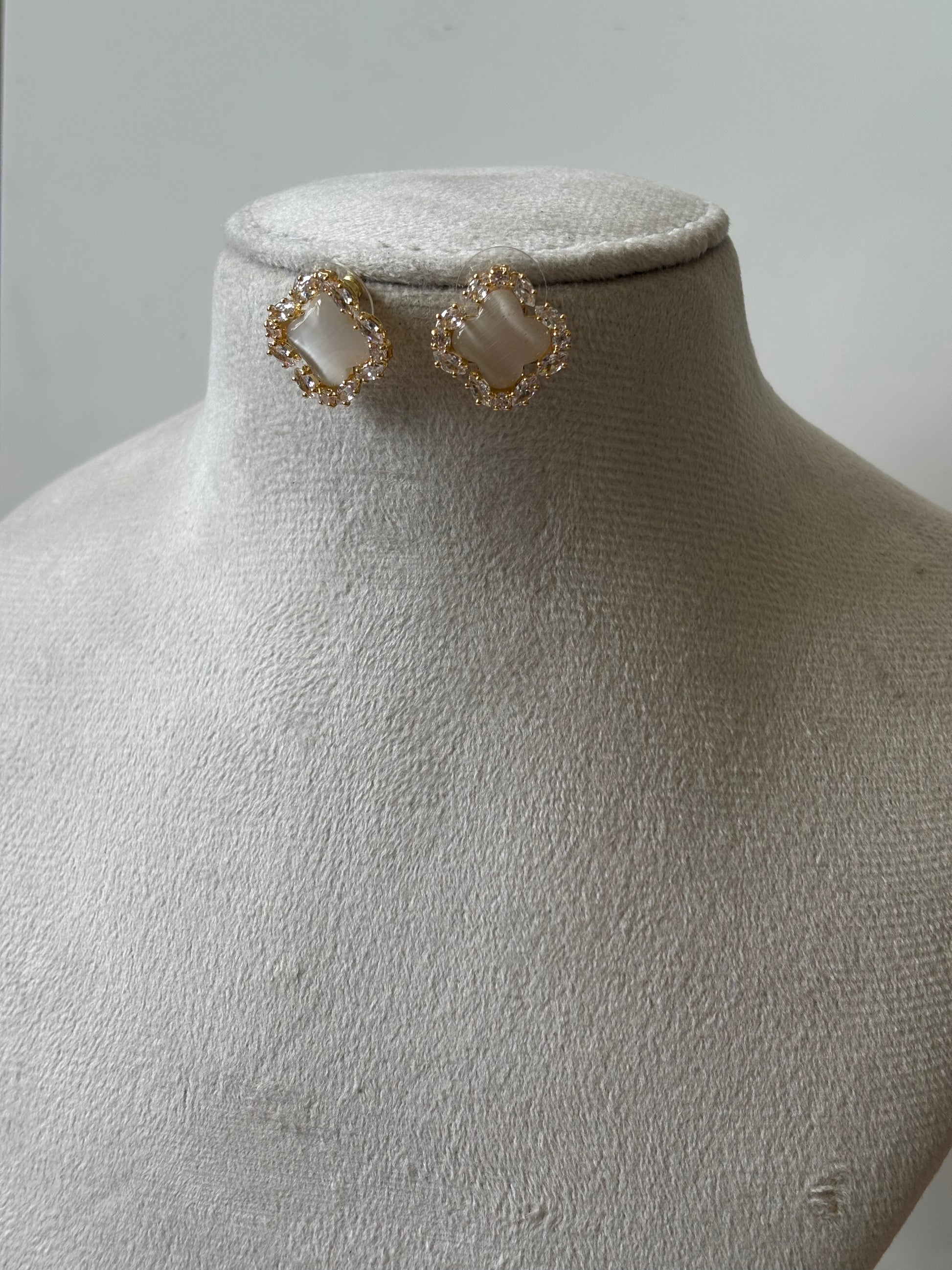 These off-white studs feature a mother of pearl center adorned with AD stones. Designed to resist tarnish, they offer a stylish and elegant appearance while being waterproof and sweat-resistant. Ideal for office wear, they provide a subtle, minimalistic jewelry option.