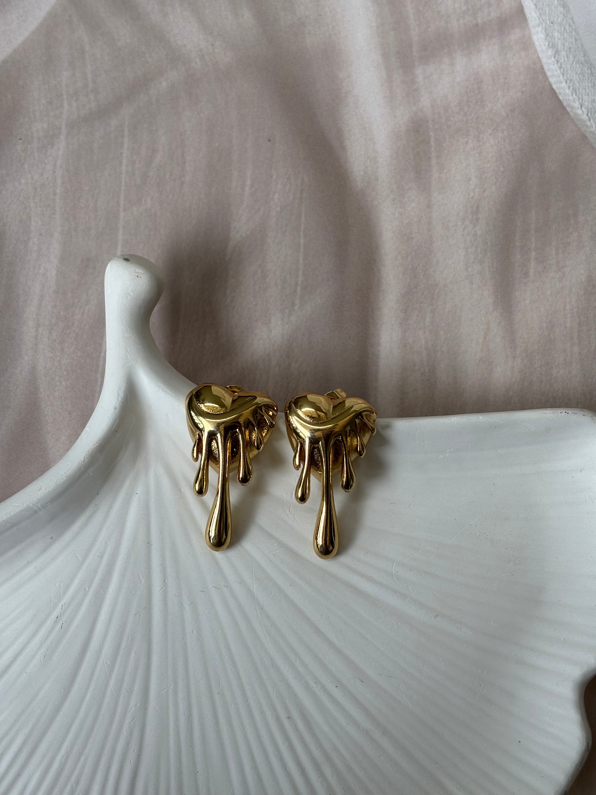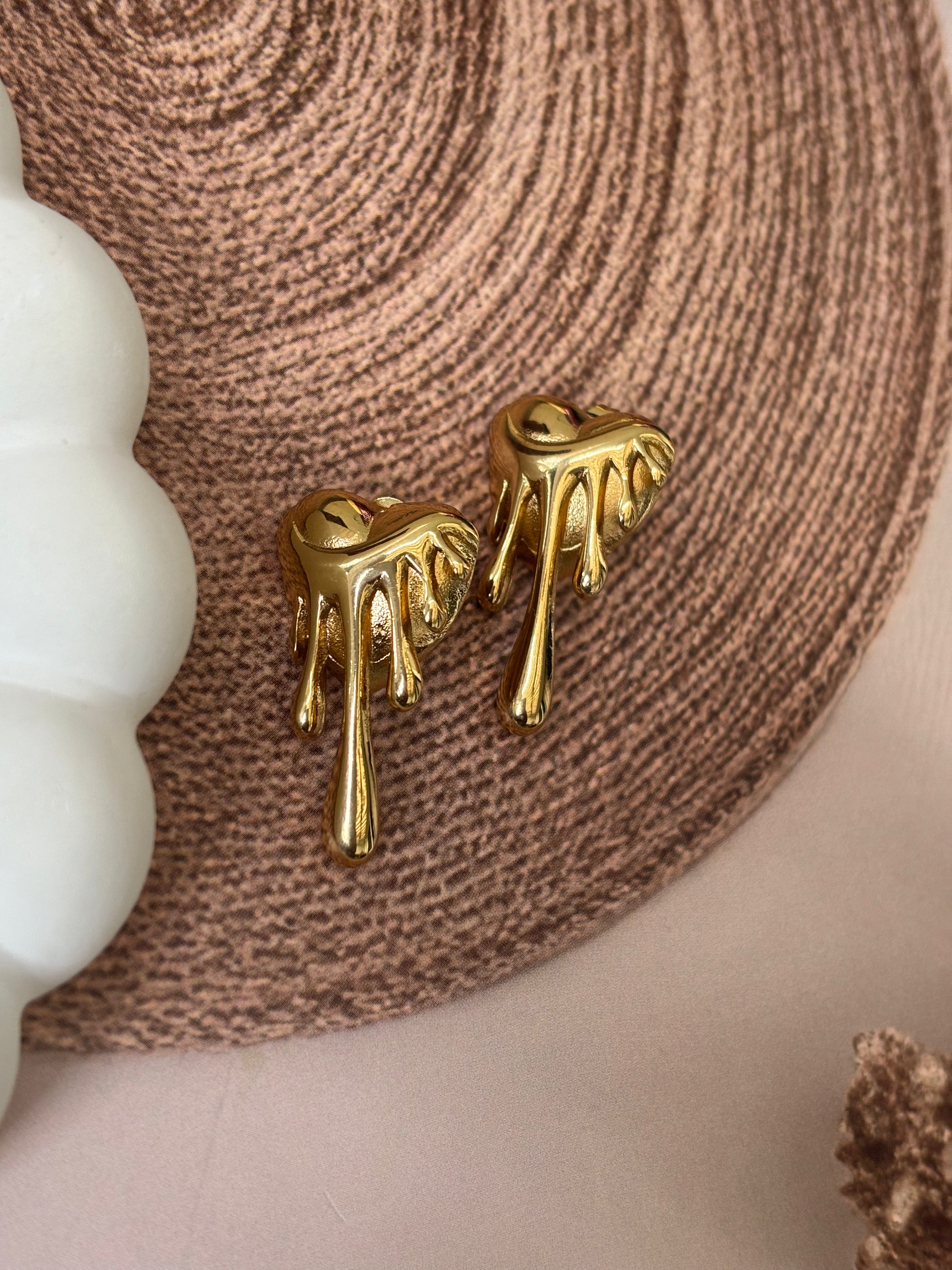 These chunky, golden melted heart drop studs feature an anti-tarnish finish, perfect for casual occasions. Their bold design complements minimal outfits like a white shirt paired with denim jeans. These earrings make a statement on their own, eliminating the need for a necklace.