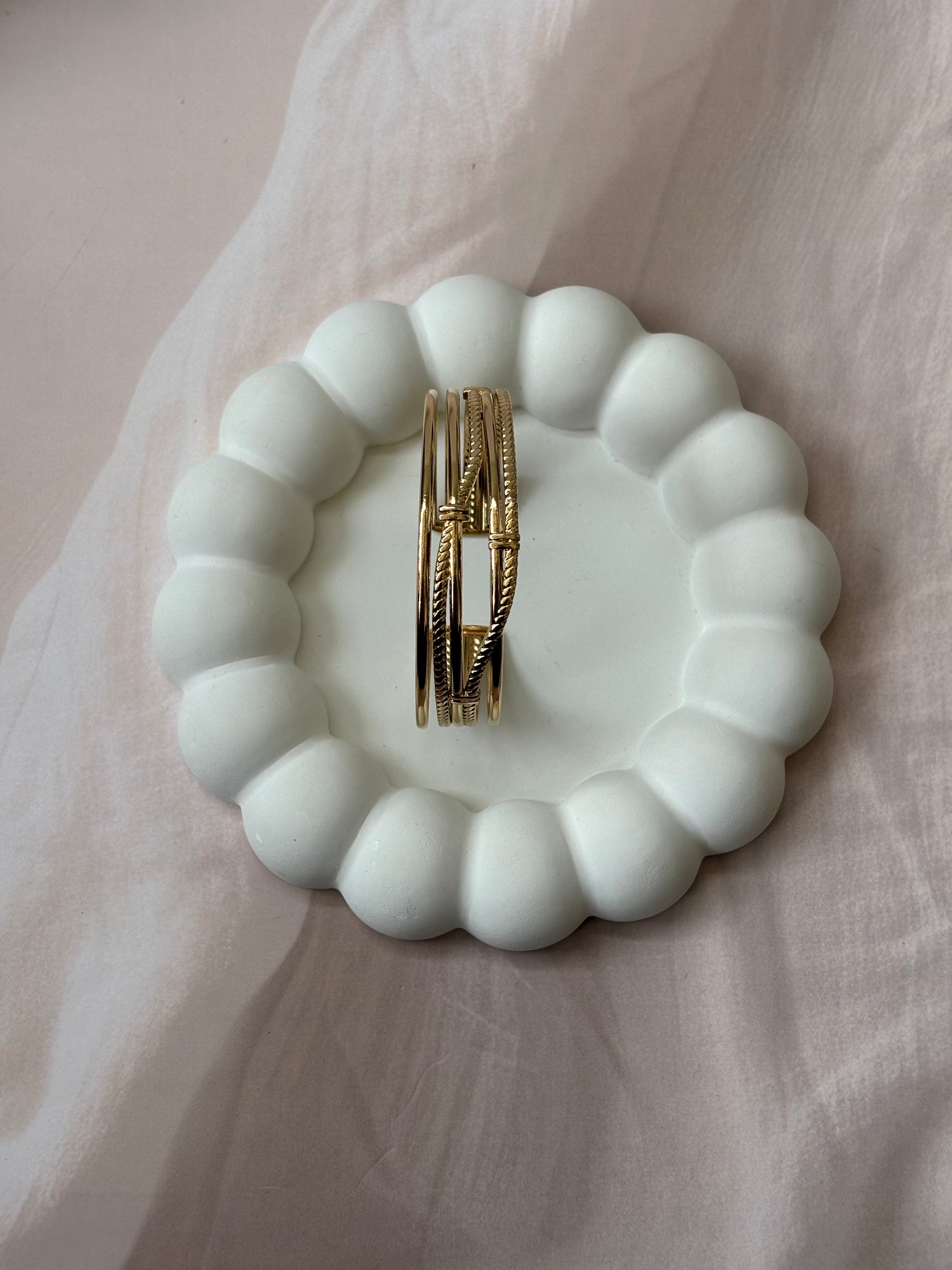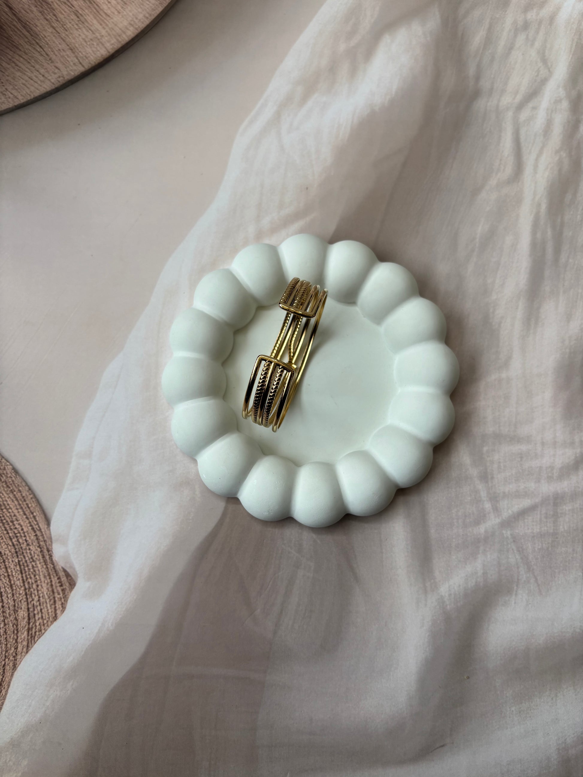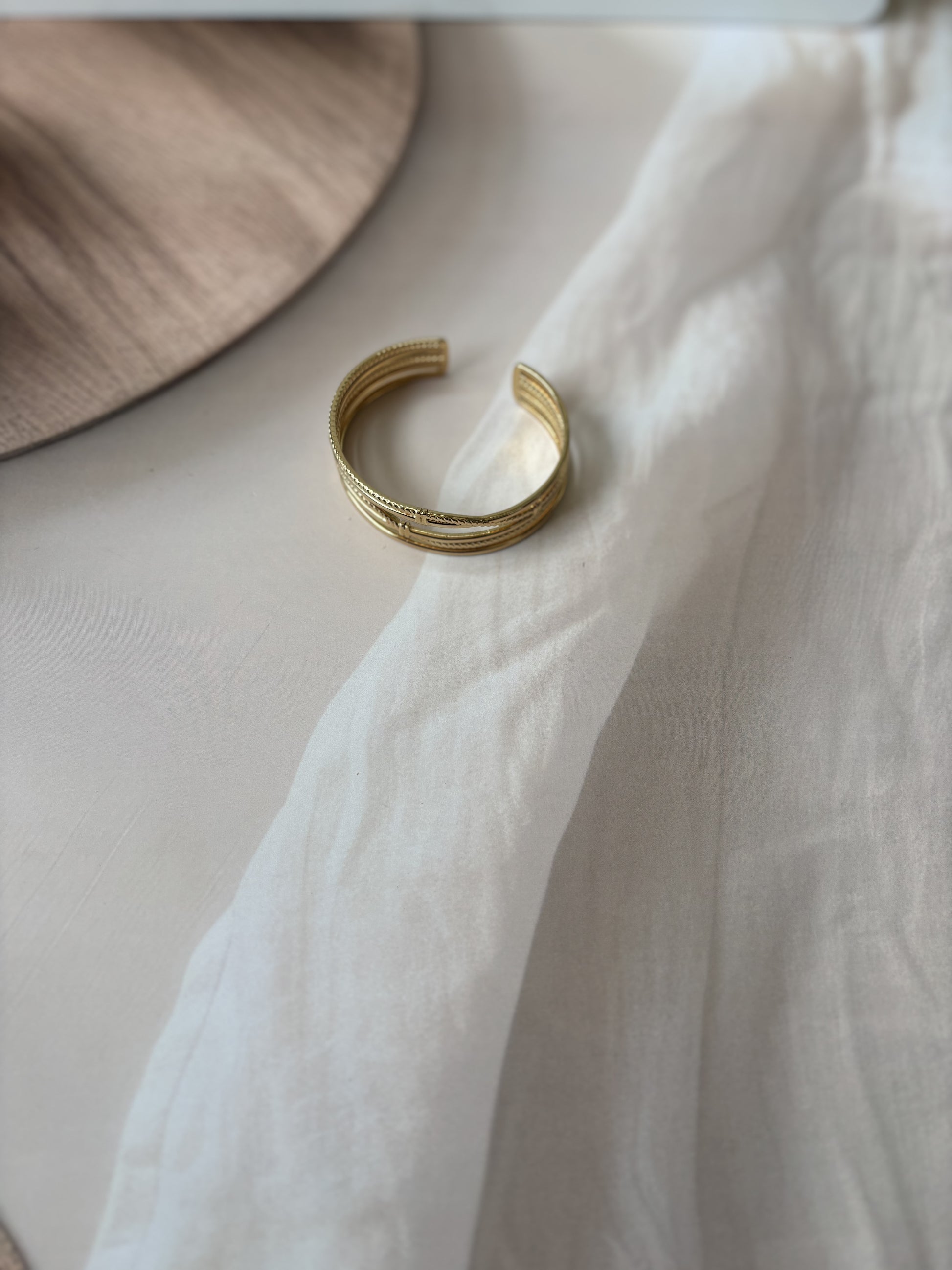 This medium-broad designer cuff features a golden antitarnish finish, offering a stylish balance between casual and semi-formal wear. It is skin-friendly, waterproof, and resistant to sweat, ensuring durability and comfort throughout the day.
