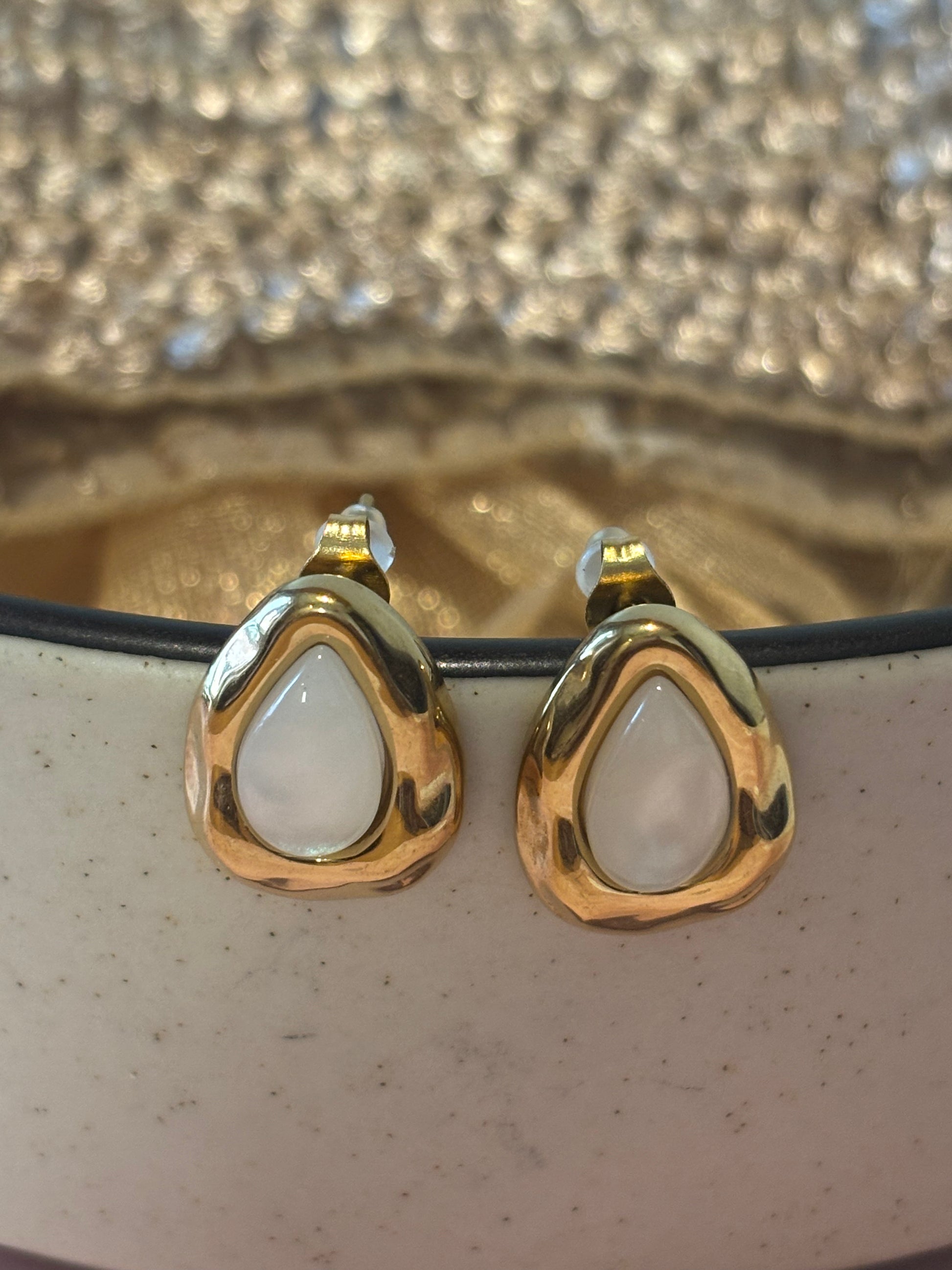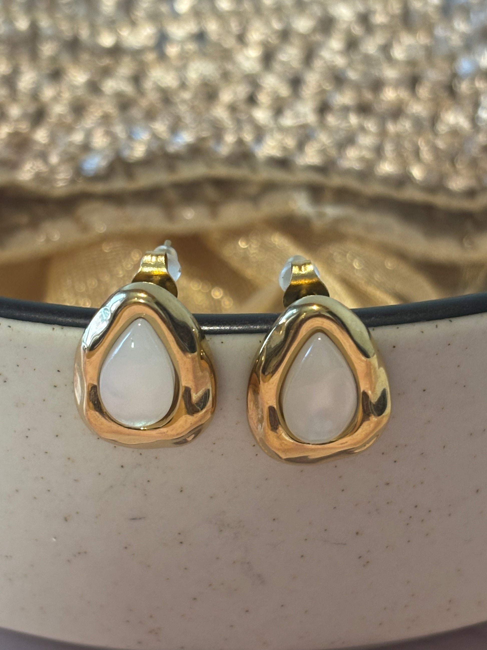 These droplet earrings feature a distinctive Monalisa stone, combining elegance with a unique design. Crafted with an anti-tarnish finish, they maintain their shine and beauty over time, making them ideal for casual outings. Their stylish yet subtle appeal adds a refined touch to everyday wear.