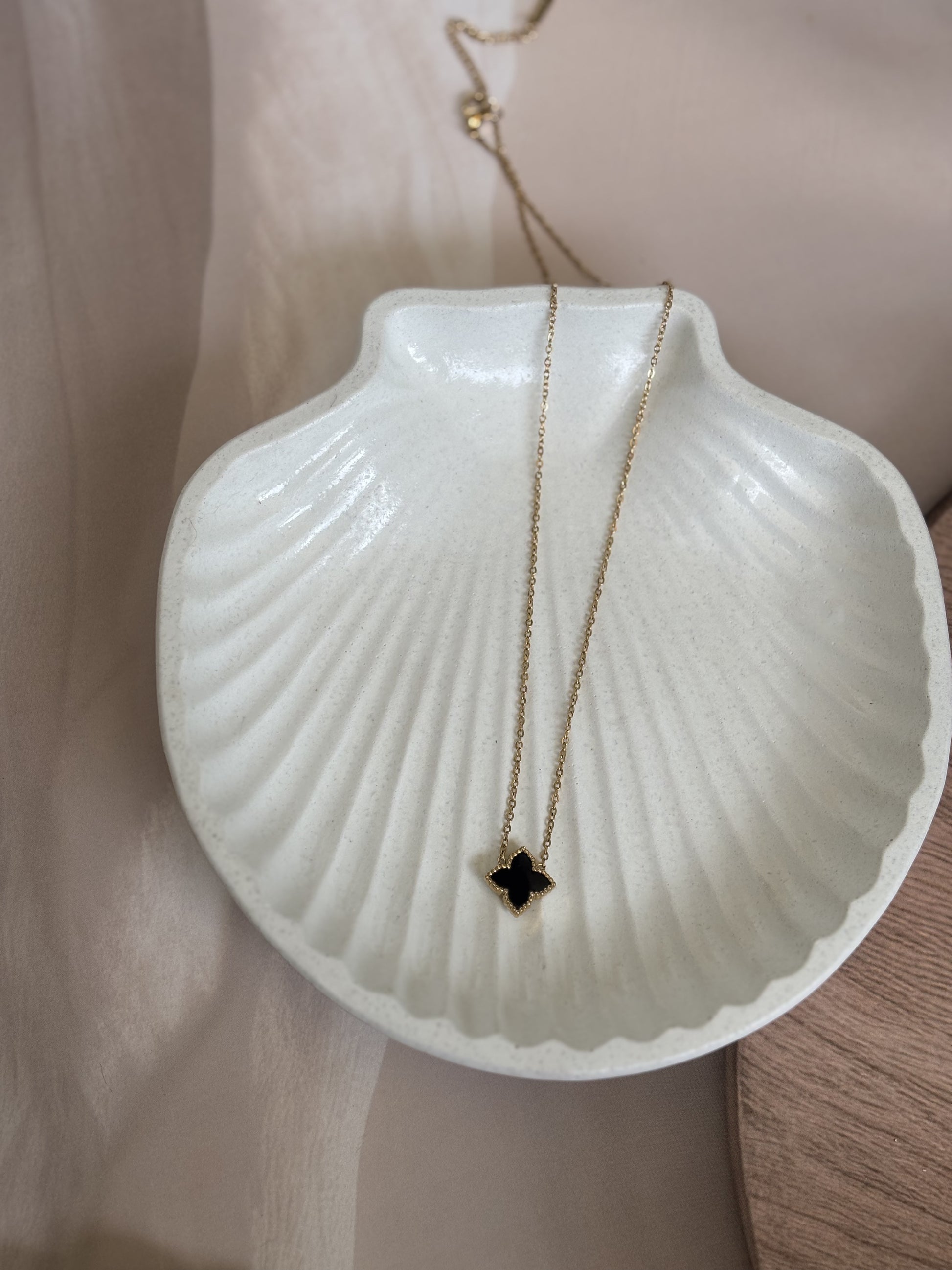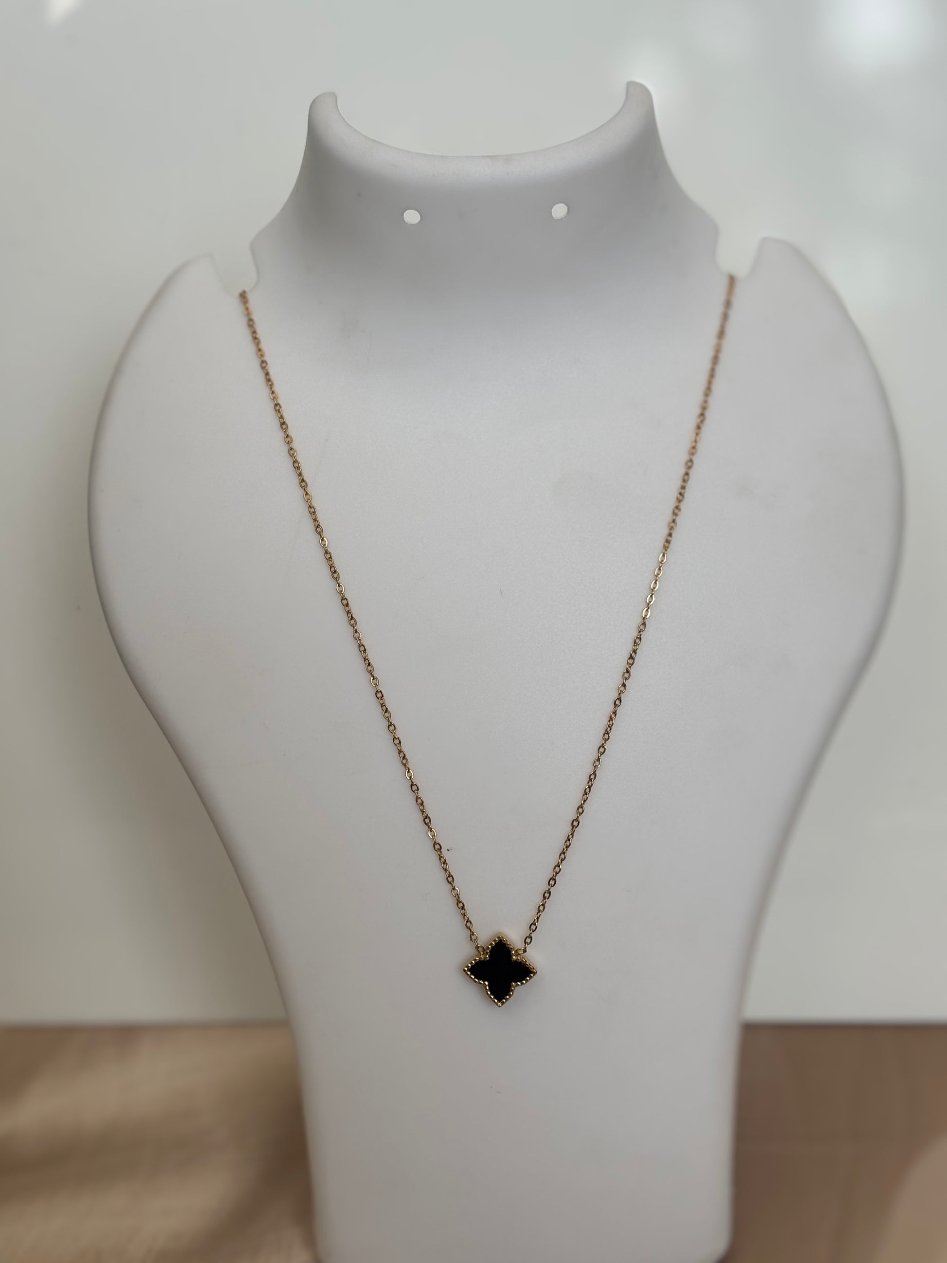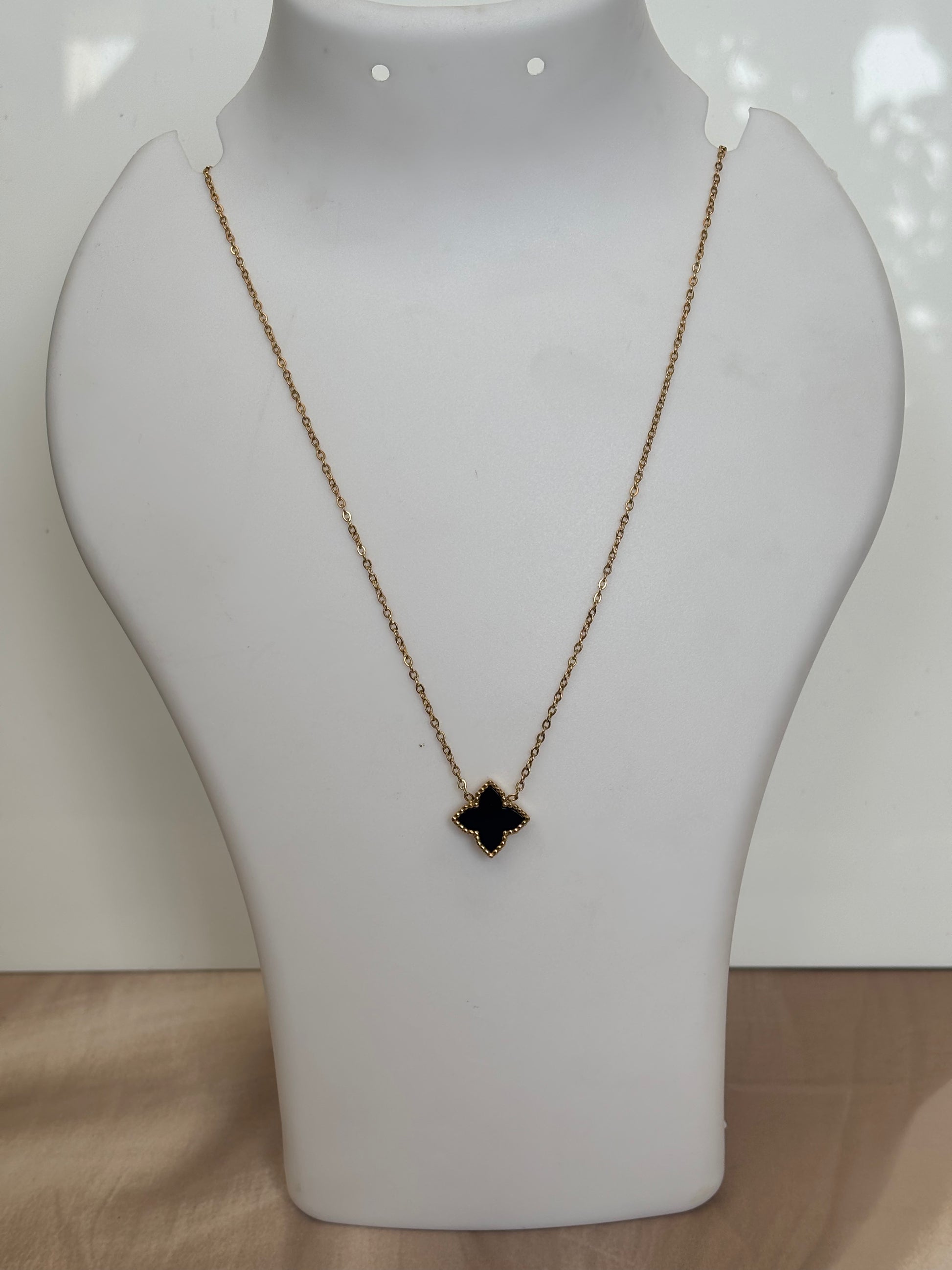 This Golden Black Quadraleaf pendant necklace features a reversible design with a 21 cm chain. Its delicate, minimalist style suits casual wear perfectly. One side showcases a black finish, while the reverse displays a white surface adorned with AD stones. Crafted to be anti-tarnish and skin-friendly, it offers both elegance and durability.