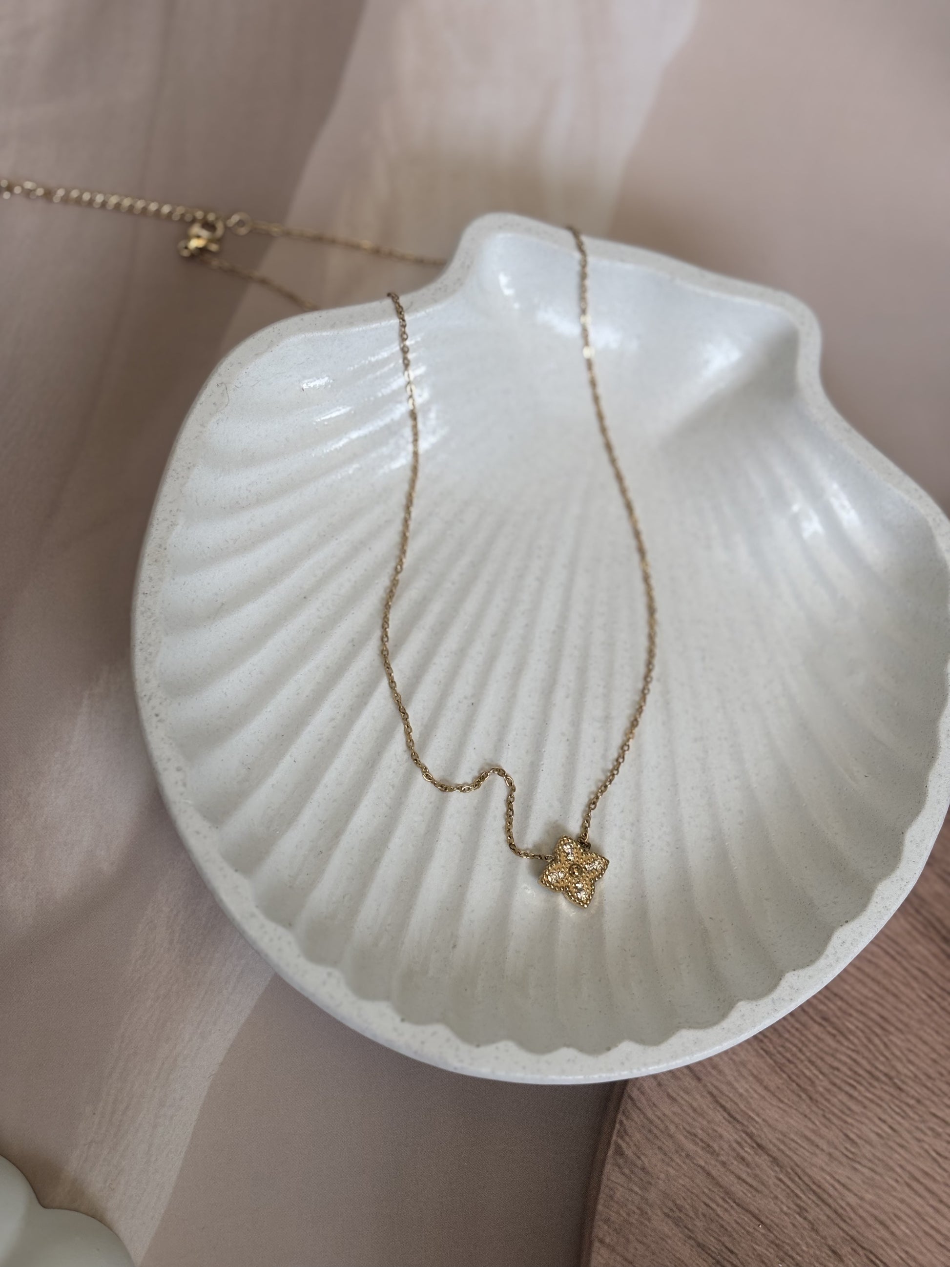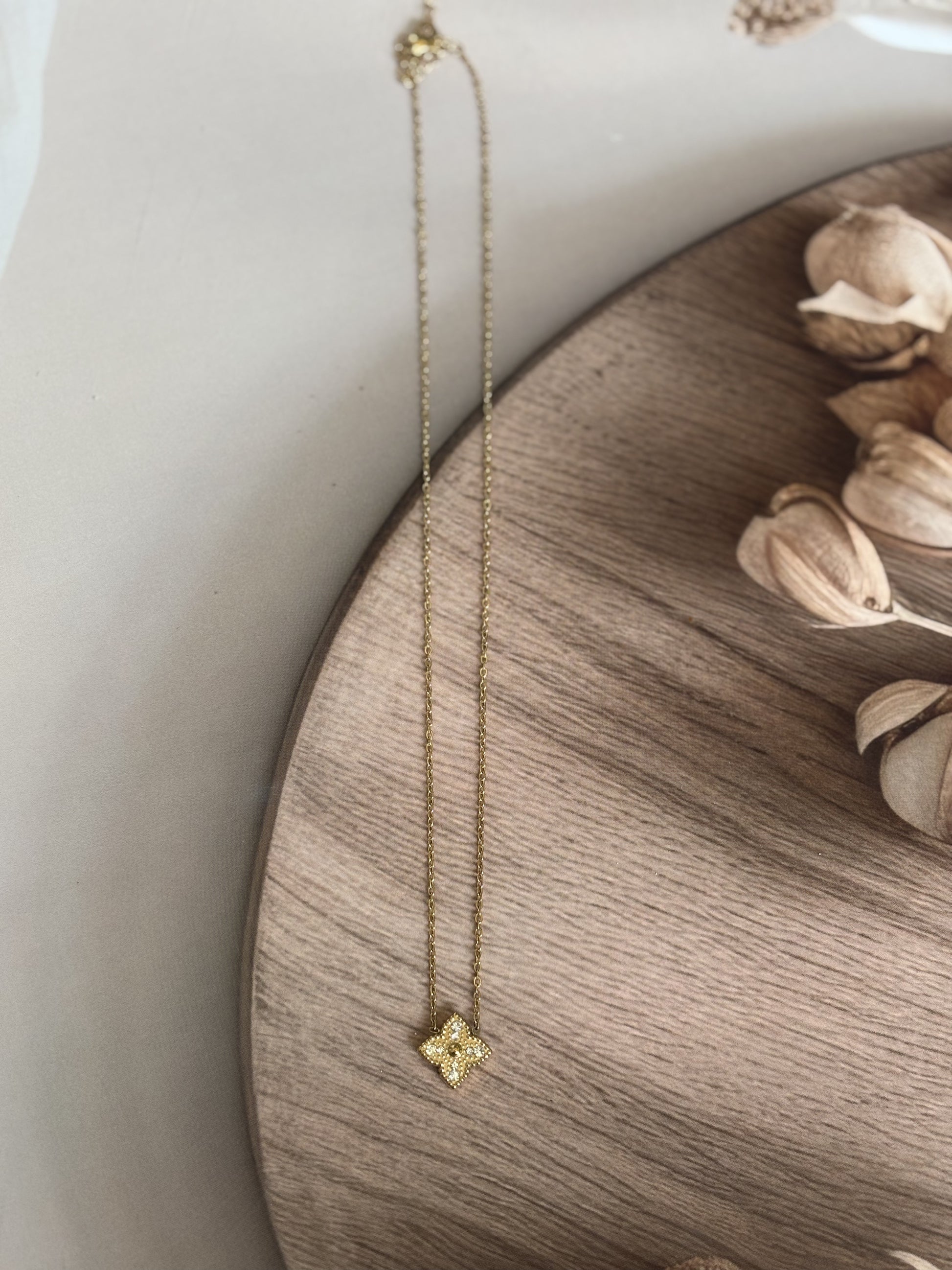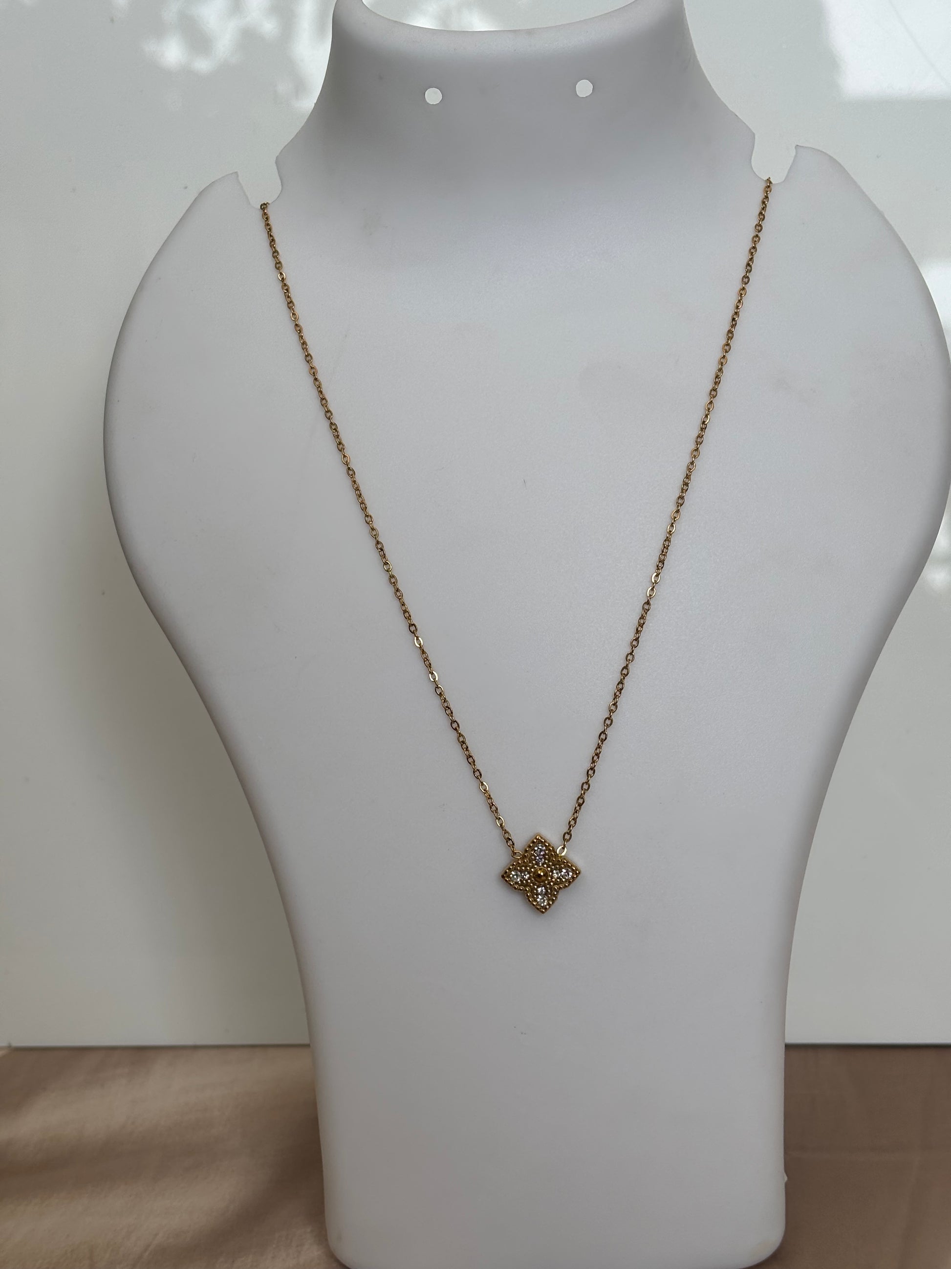 This Golden Black Quadraleaf pendant necklace features a reversible design with a 21 cm chain. Its delicate, minimalist style suits casual wear perfectly. One side showcases a black finish, while the reverse displays a white surface adorned with AD stones. Crafted to be anti-tarnish and skin-friendly, it offers both elegance and durability.