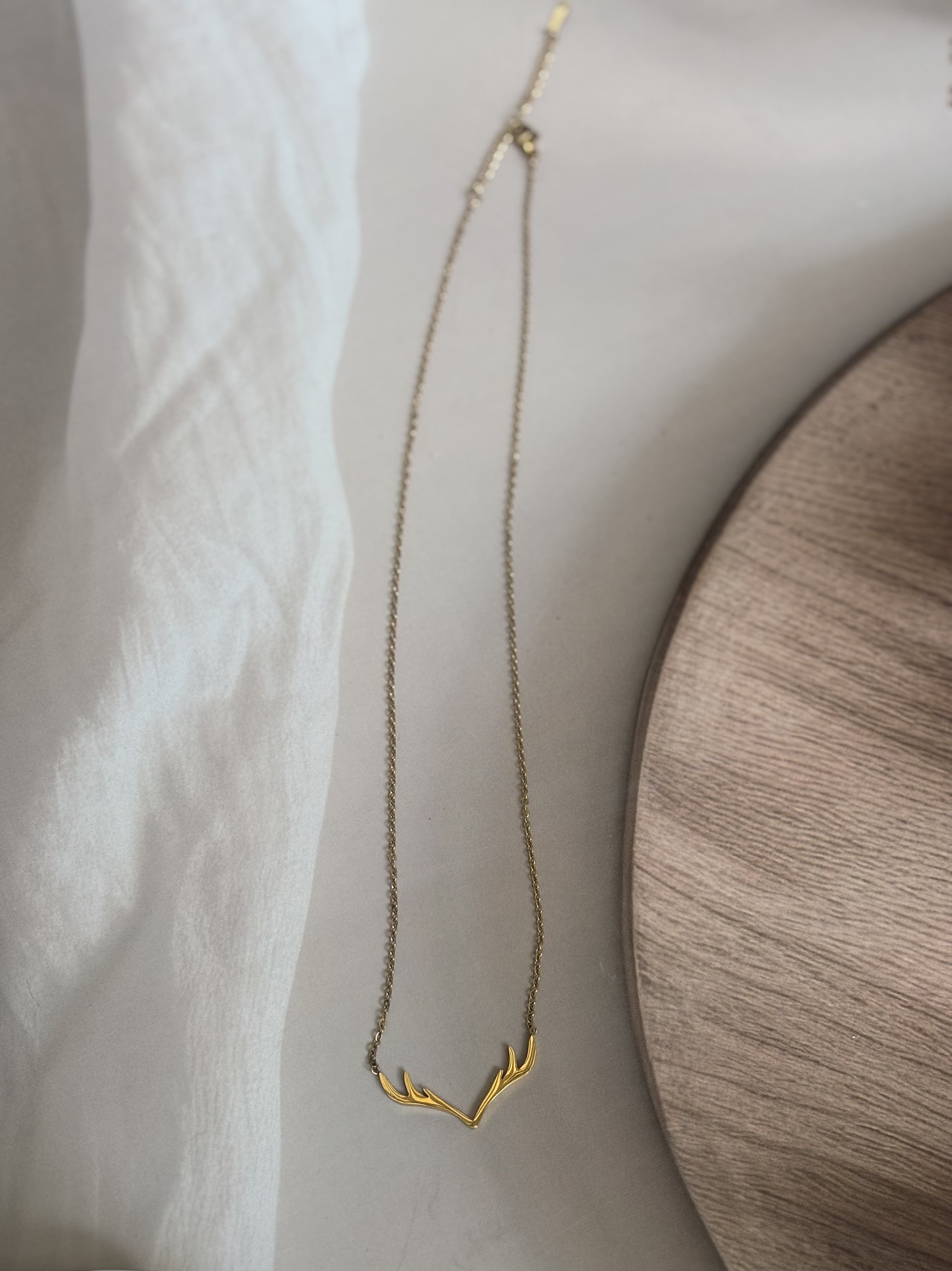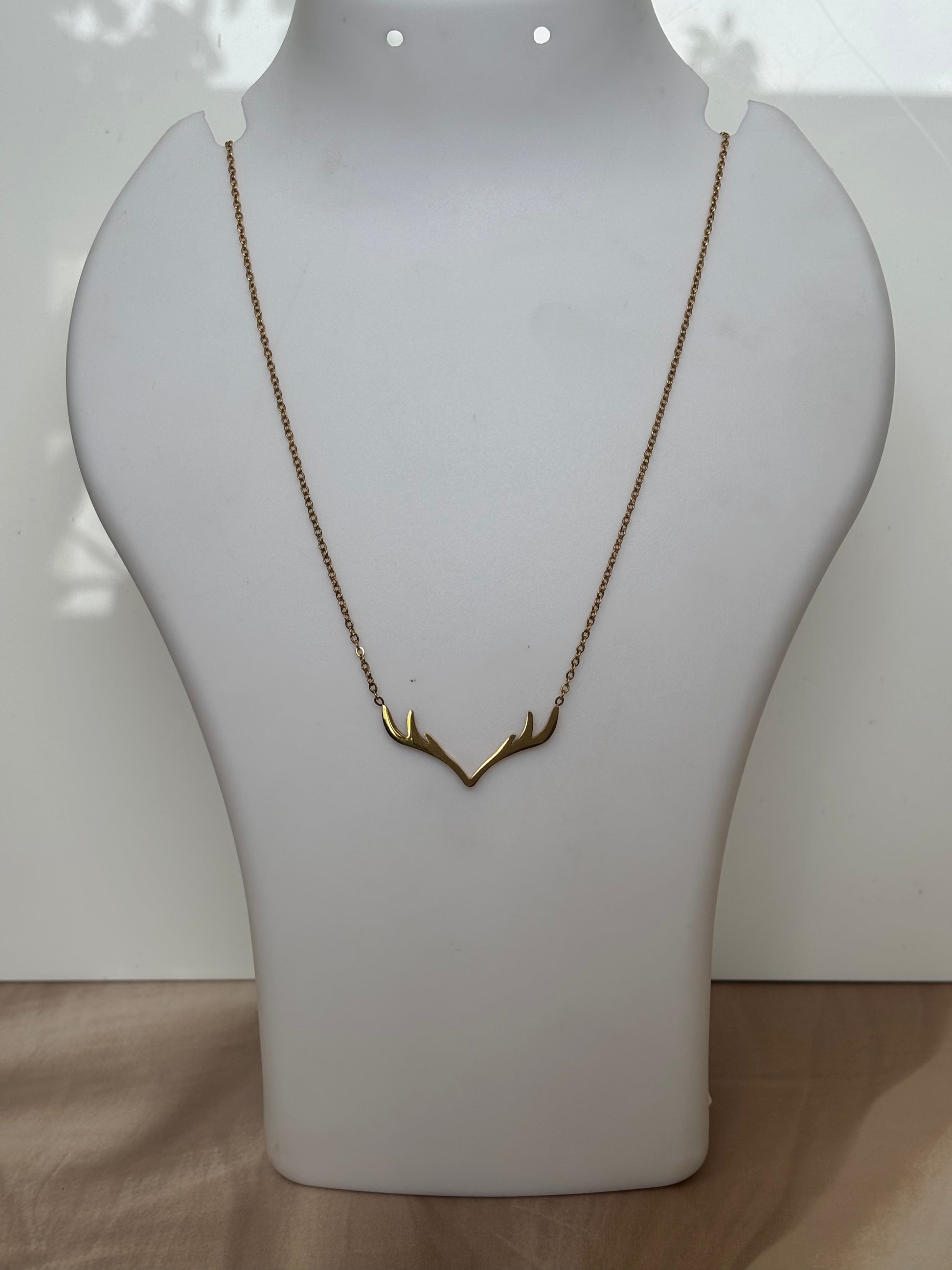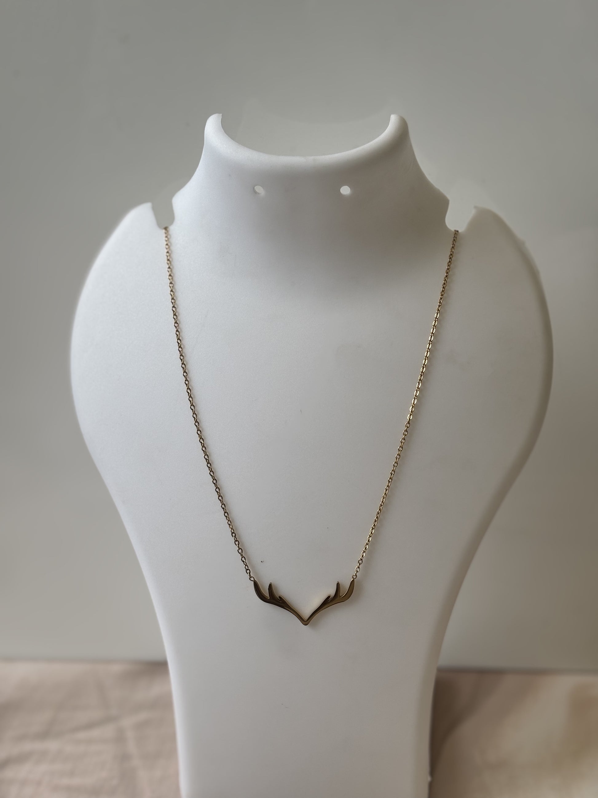 The Golden Deer Antler Necklace features a 21cm chain and exudes elegance with its stylish design. Popular across social media platforms like Pinterest, this necklace combines affordability with skin-friendly materials. It is also anti-tarnish and water-resistant, ensuring lasting quality and wearability.