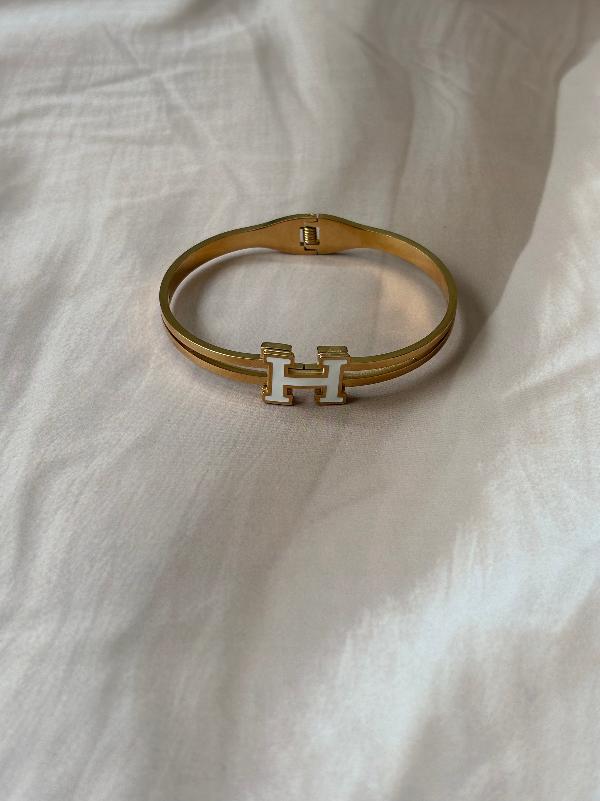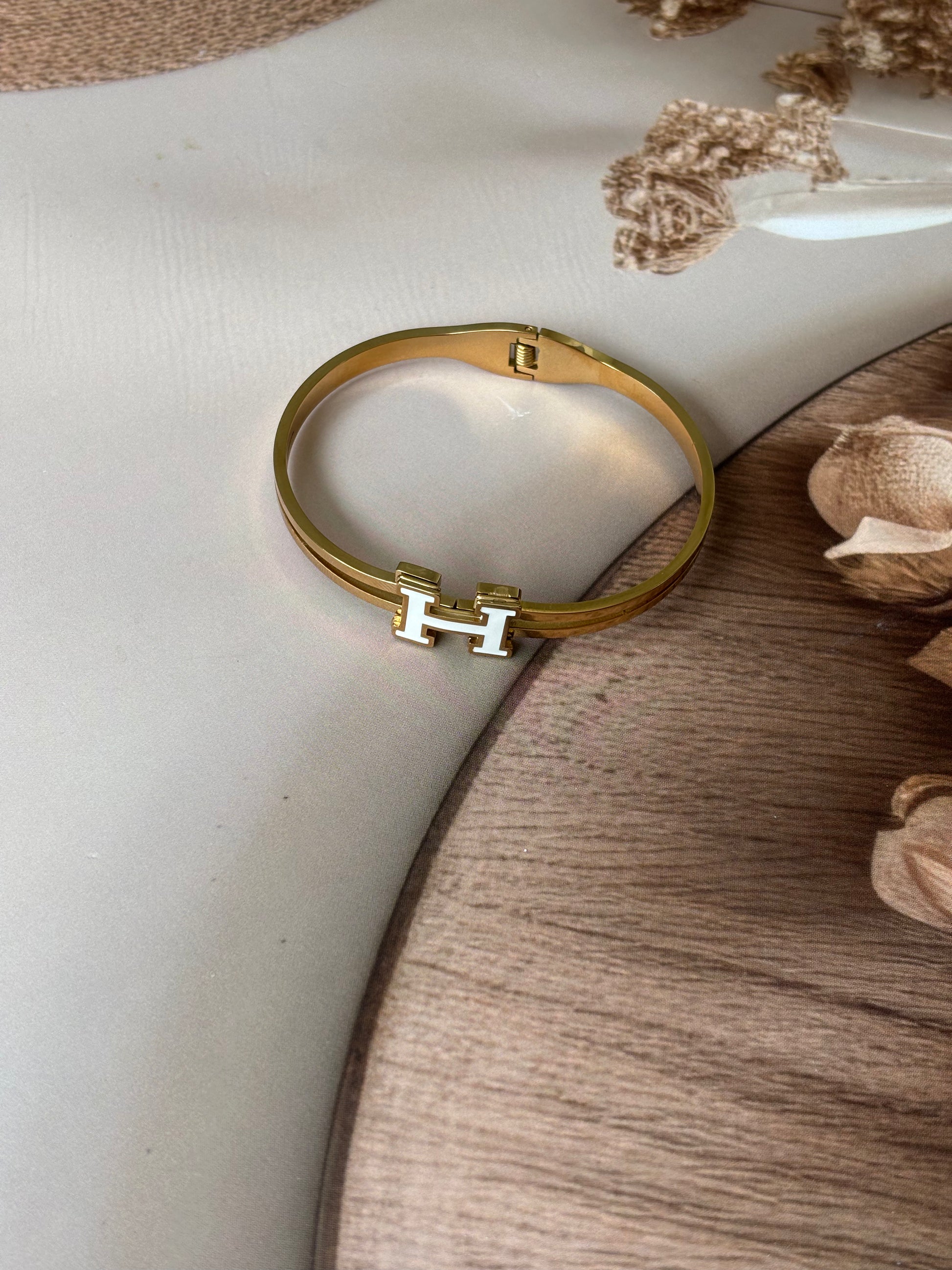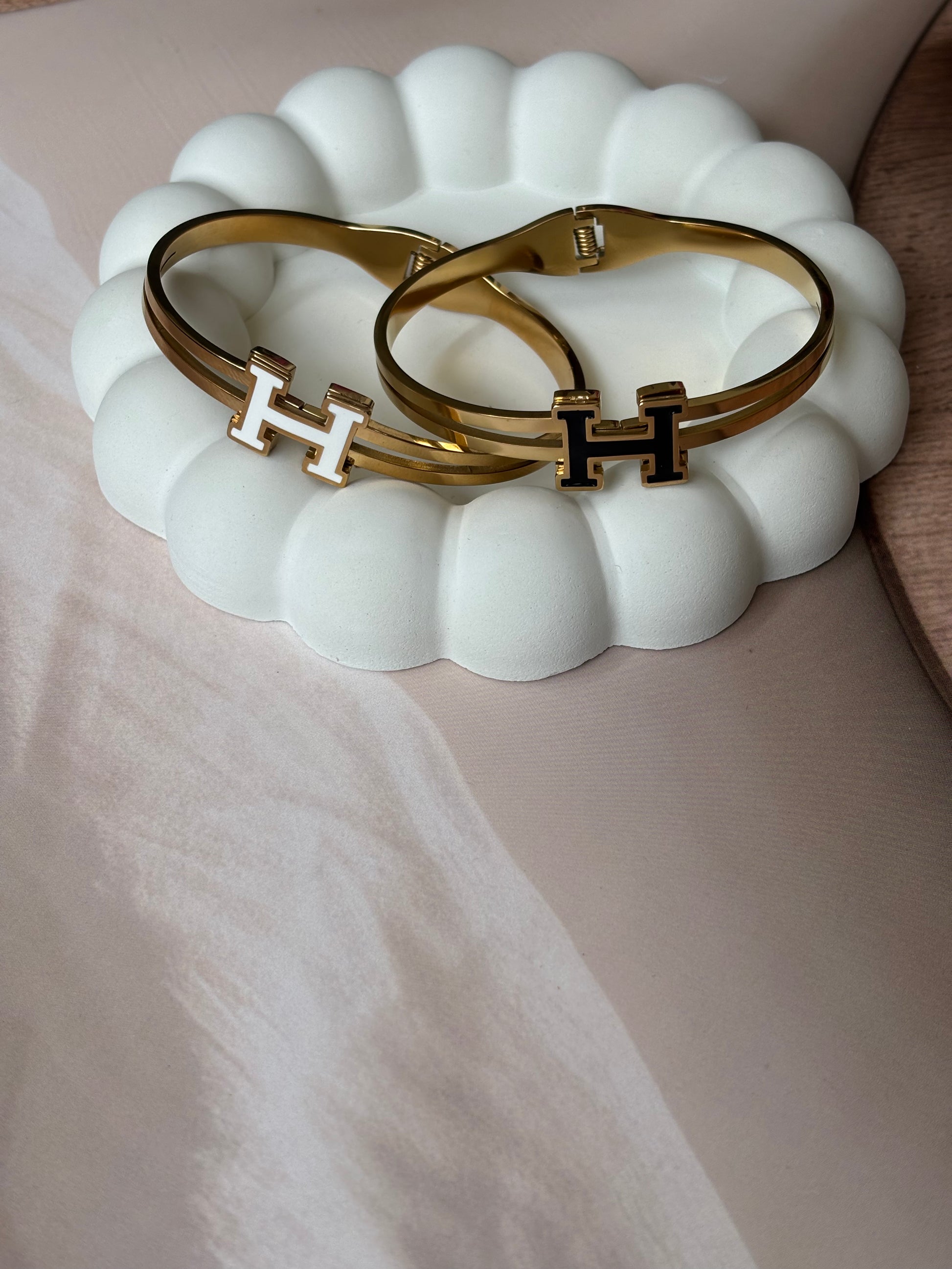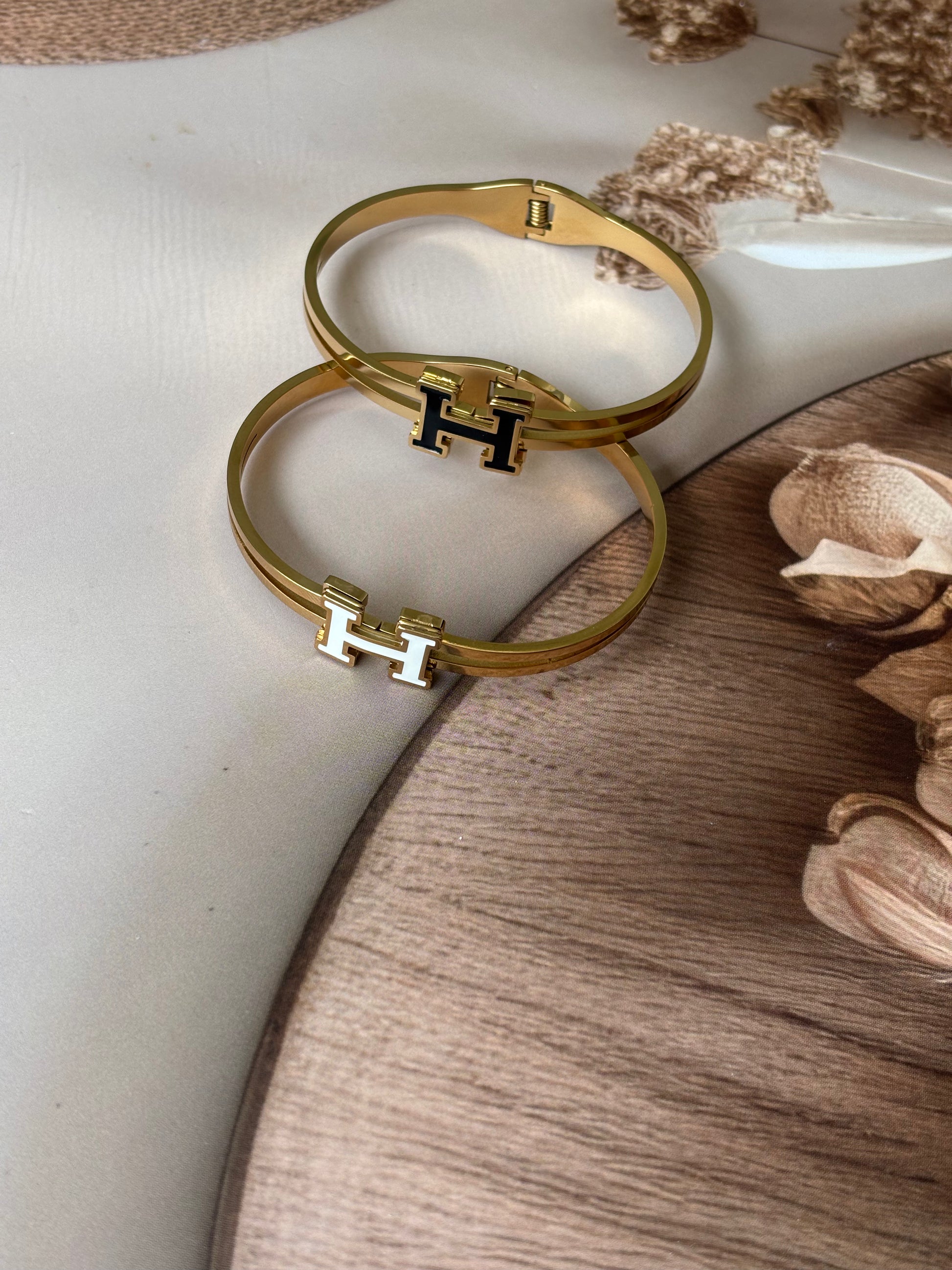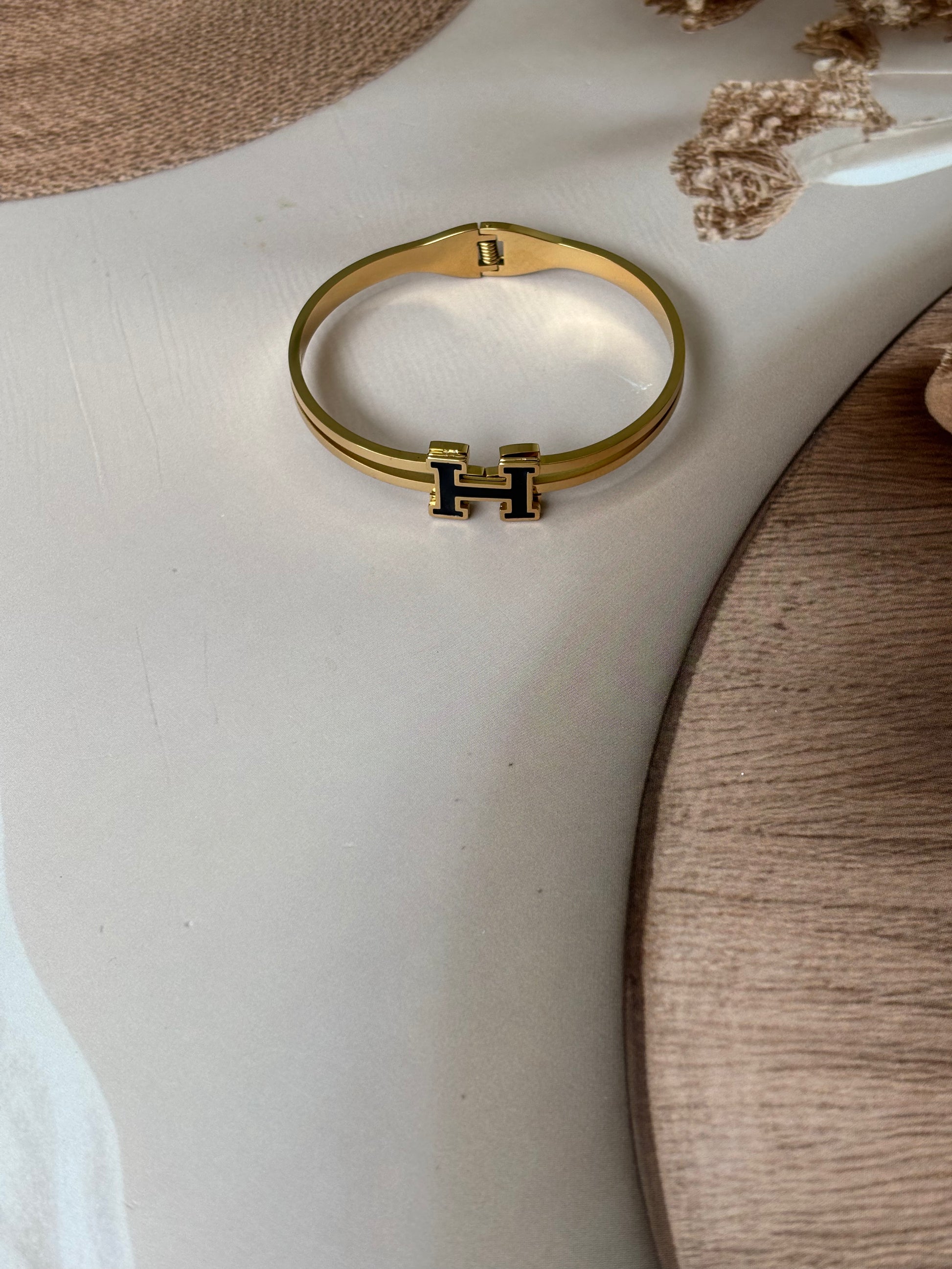 The H design bracelet in black is a sophisticated accessory crafted for those who appreciate elegance and style. Featuring an openable kada design, it offers ease of wear and a secure fit. Sized at 2.6 inches, this bracelet is perfectly proportioned to complement any wrist. Made with an anti-tarnish finish, it maintains its sleek appearance over time, ensuring lasting shine and durability. Ideal for both casual and formal occasions, this bracelet adds a refined touch to your collection with its modern yet timeless design.