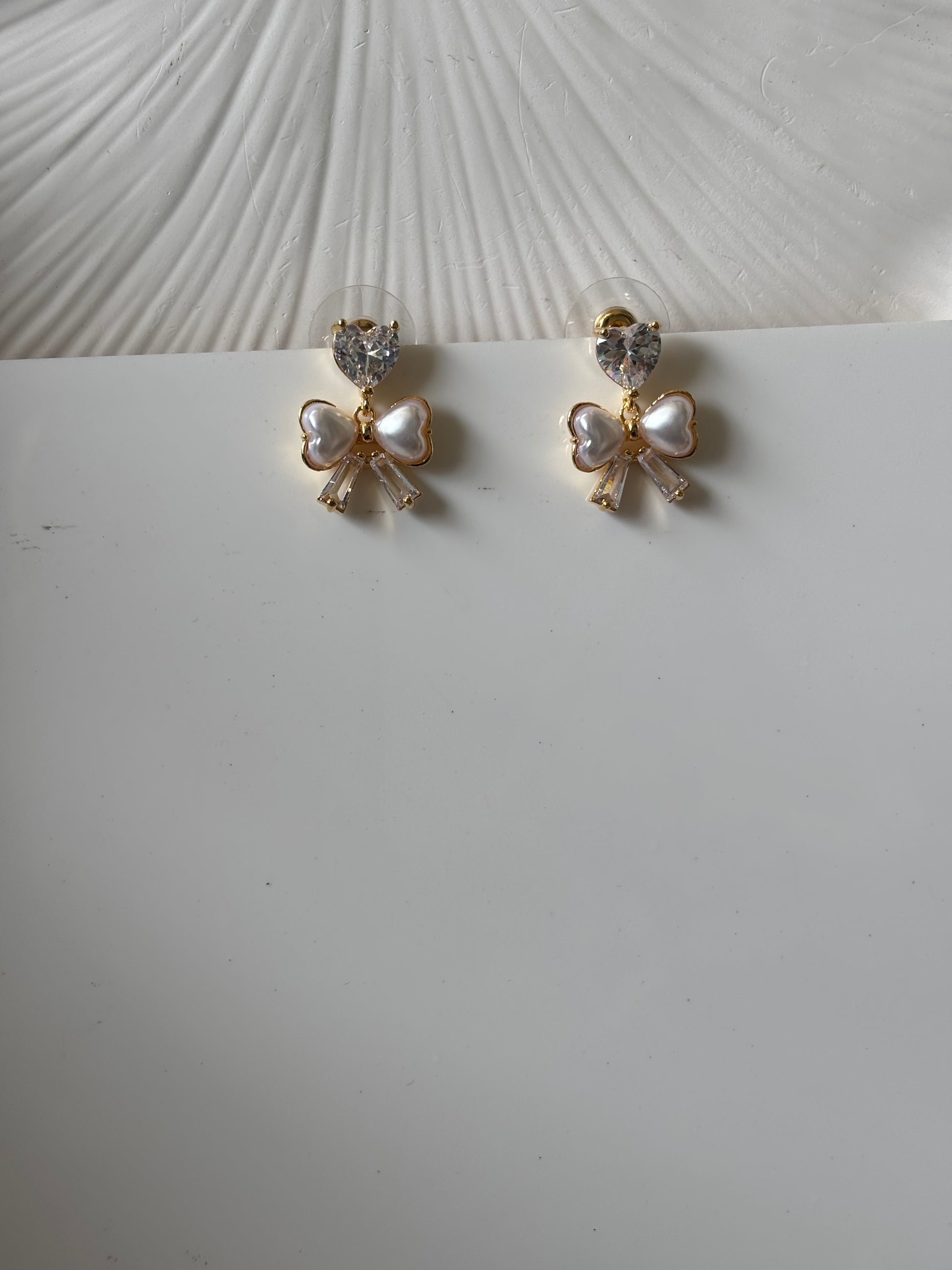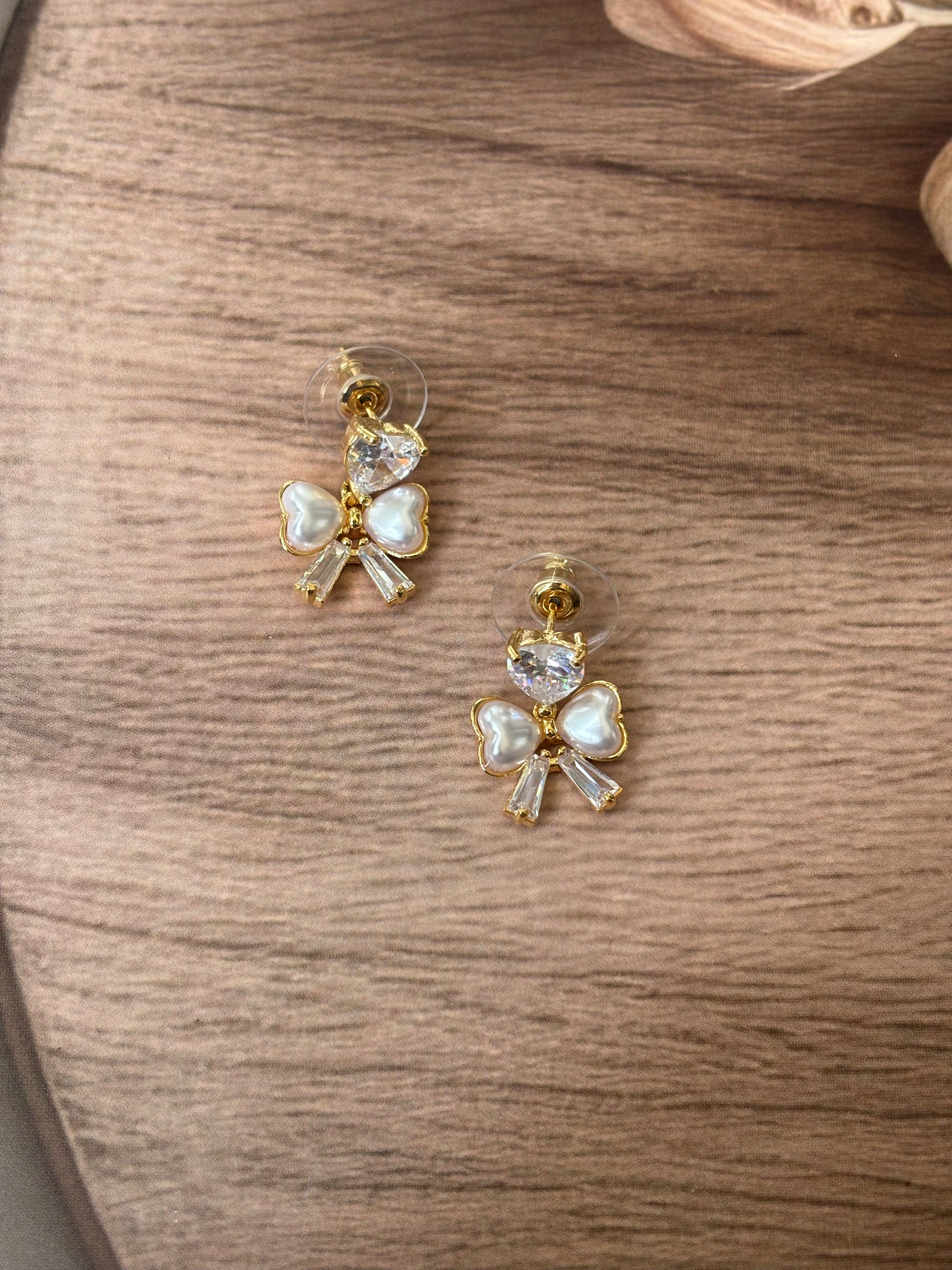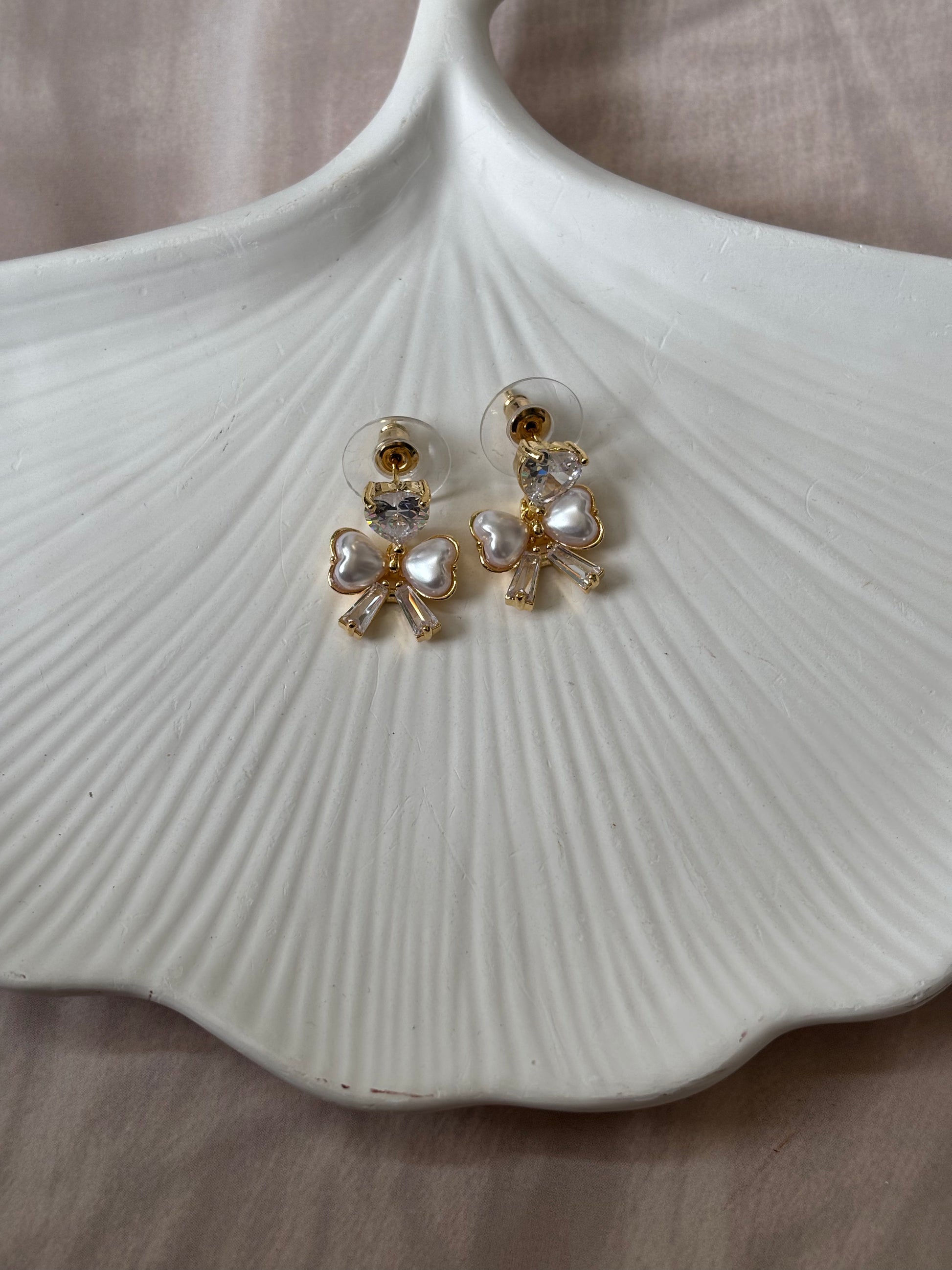 These lightweight earrings feature a delicate dangling bow adorned with AD stones and pearls, designed with antitarnish properties. Their small size offers a refined, elegant minimalism, making them perfect for college or everyday stylish wear.