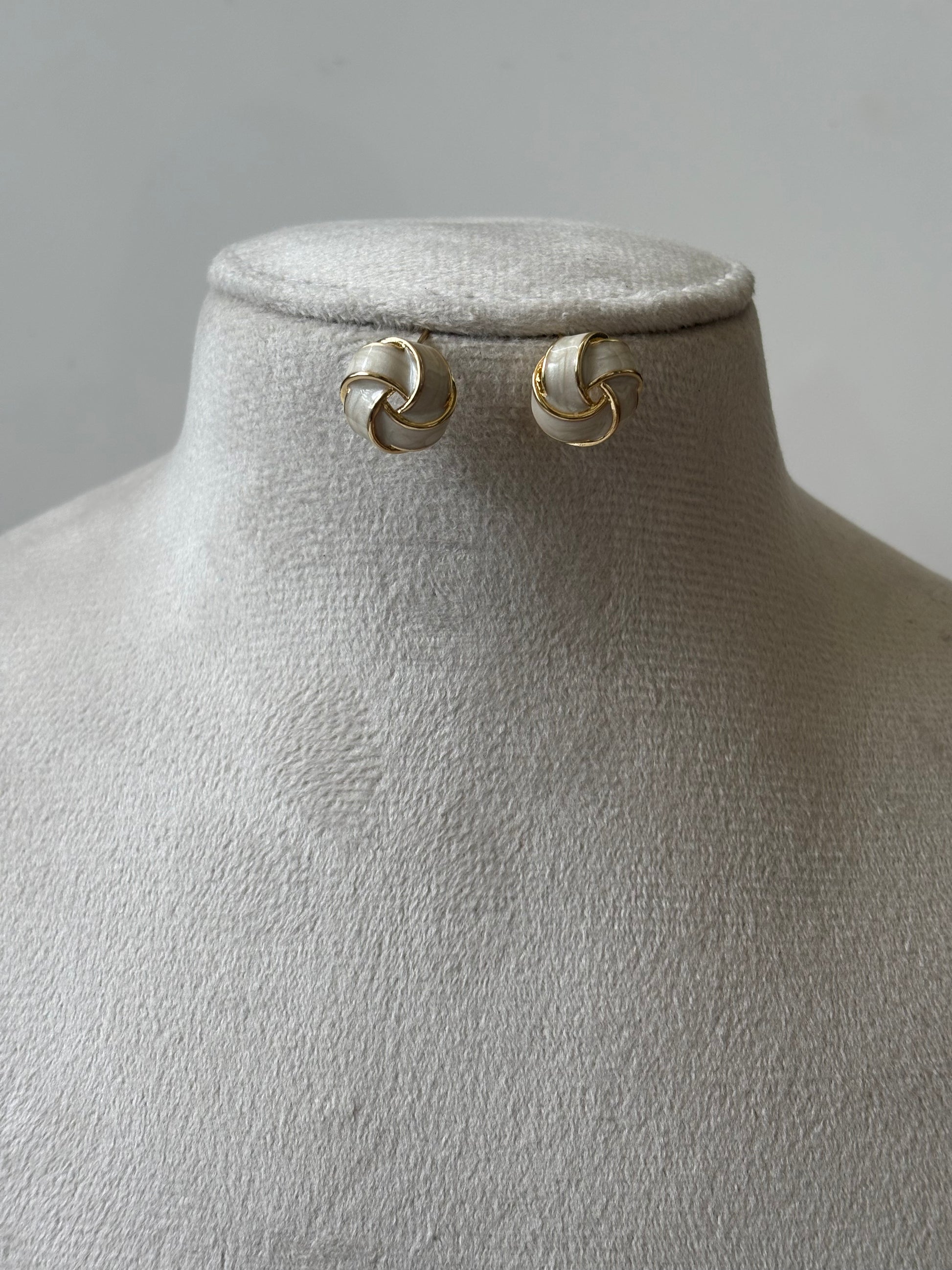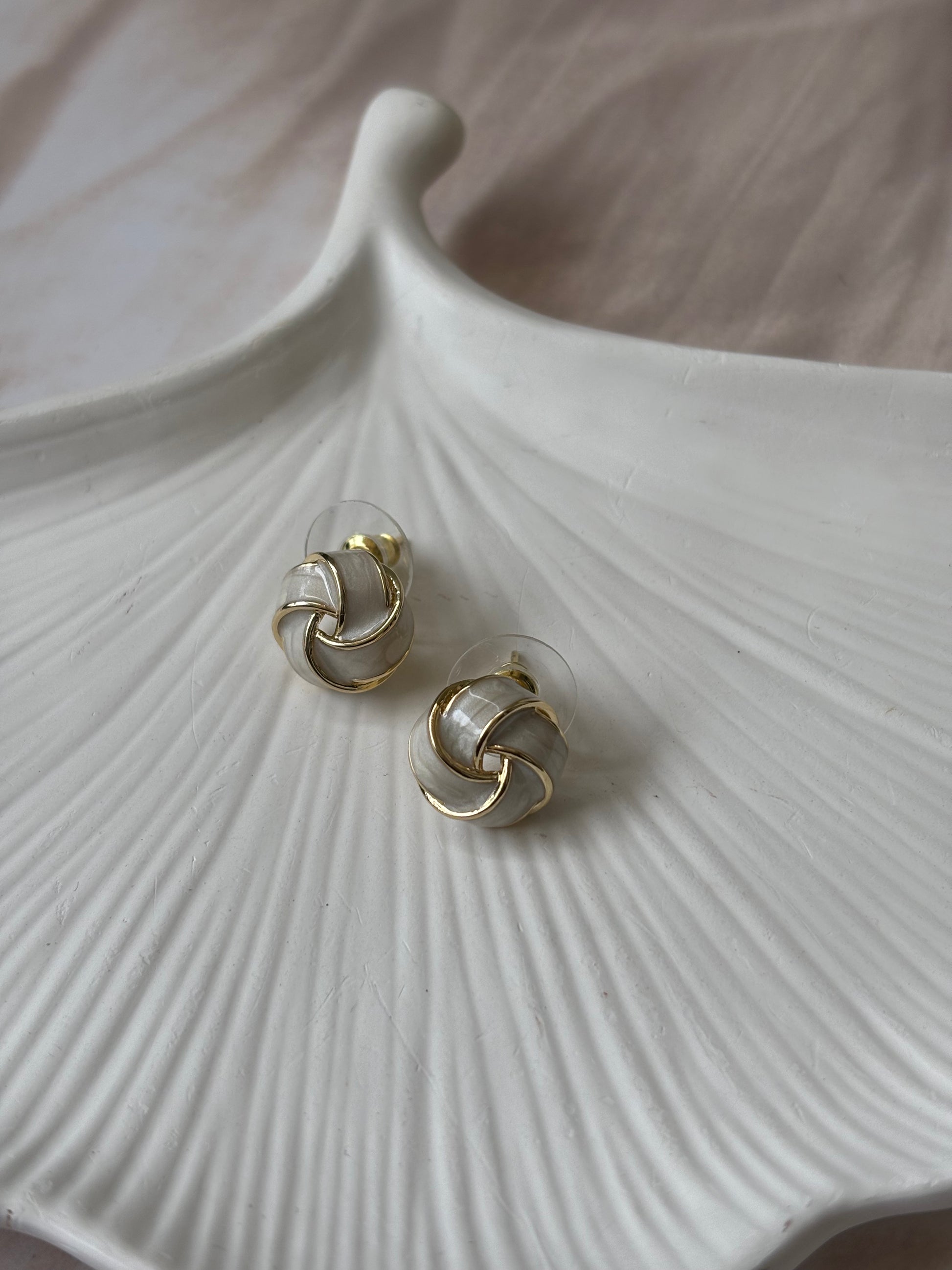 White woven basket studs crafted with 18k gold plating offer a stylish and elegant look. These earrings are waterproof, sweat-resistant, and designed to resist tarnishing, delivering a luxurious appearance at an accessible price point.